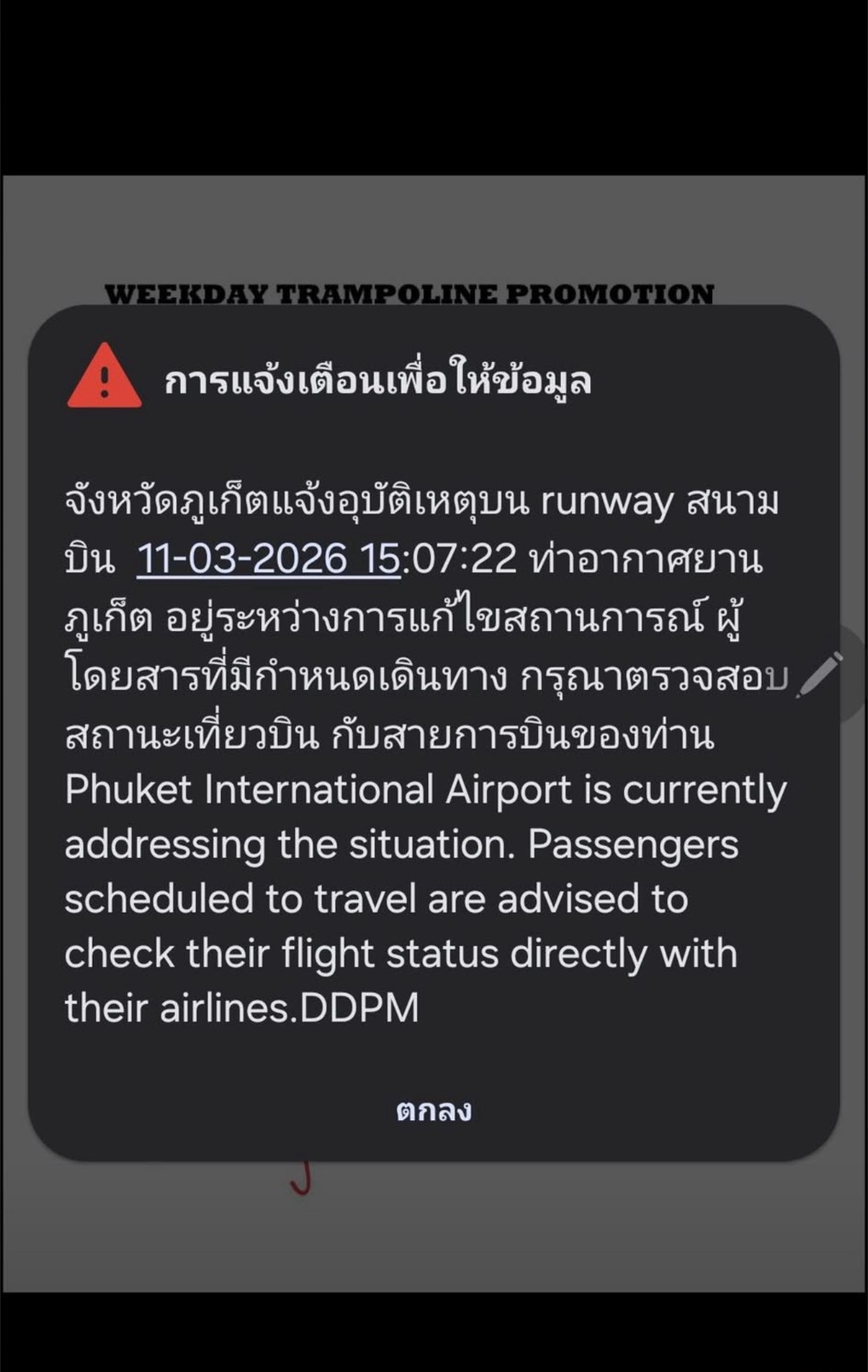 พอดีได้รับข้อความแจ้งเตือนสถานการณ์ฉุกเฉิน (Cell Broadcast) เกี่ยวกับสถานการณ์ที่ ท่าอากาศยานนานาชาติภูเก็ต (HKT) จึงอยากนำมาแชร์ต่อเพื่อความรวดเร็วสำหรับใครที่มีแพลนกำลังจะเดินทาง หรือมีญาติพี่น้องที่กำลังรอรับ-ส่งที่สนามบินครับ