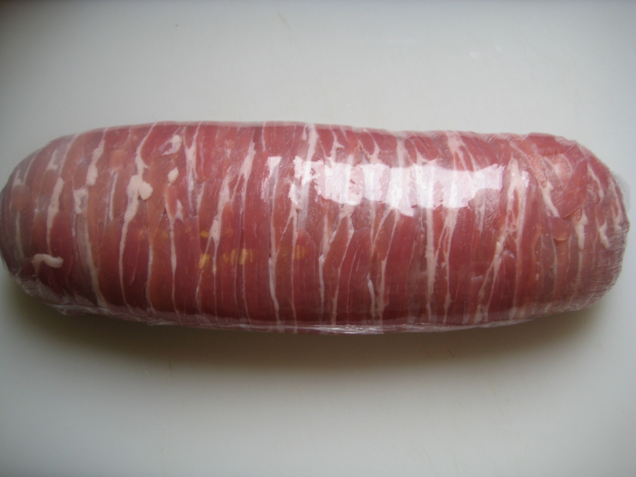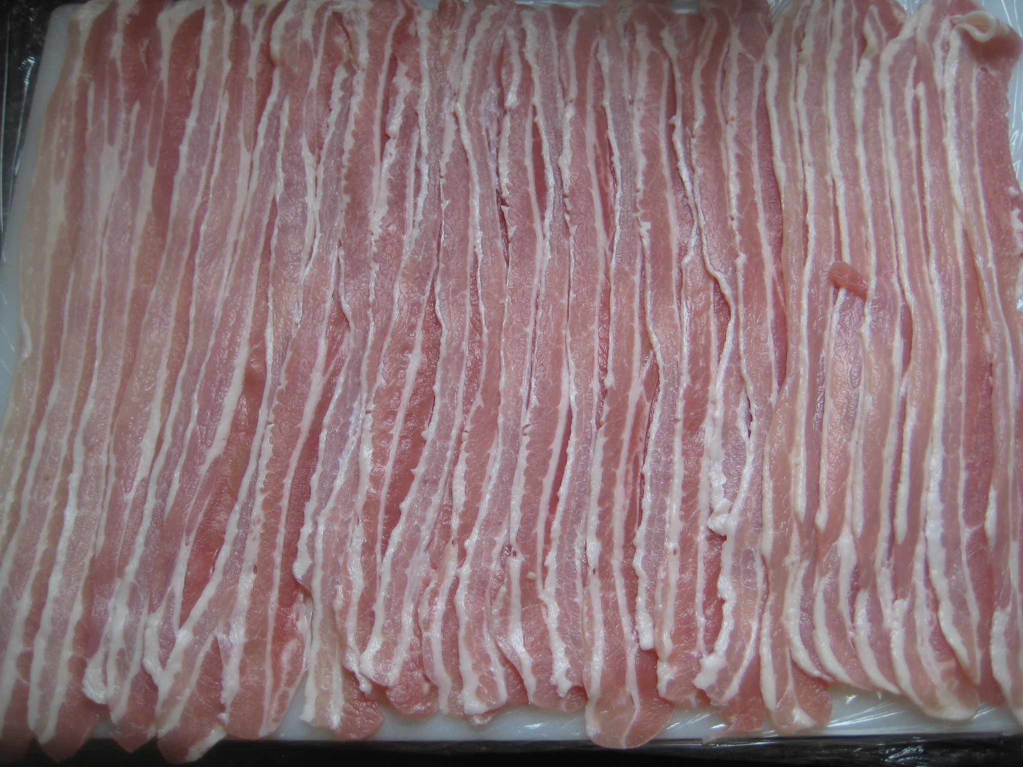 ใช้แผ่นพลาสิตสำหรับห่อ รองไว้ก่อนจากนั้นนำเบคอนมาเรียงแถวติด ๆ กัน