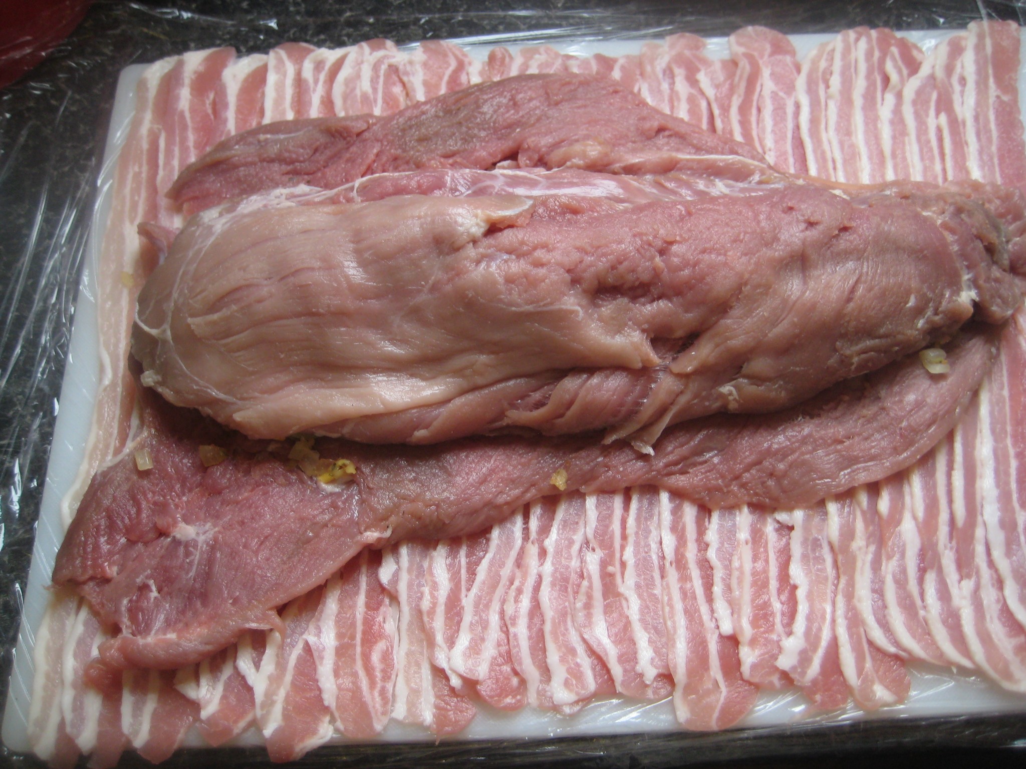 นำเนื้อหมูสันในที่ตีเป็นแผ่น วางบนเบคอน