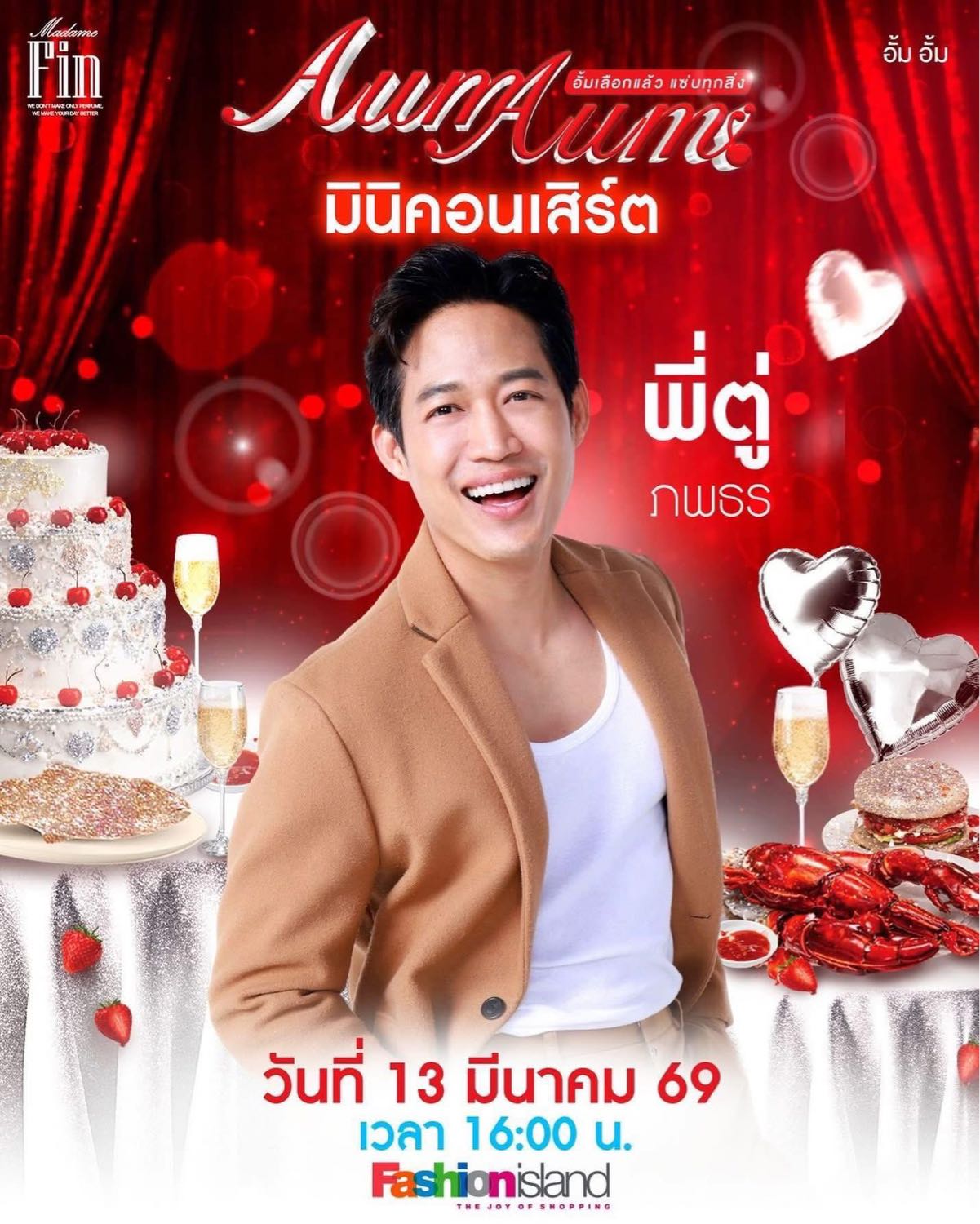 วันเปิดงาน AumAum🍒 ที่ Fashion Island เตรียมเสียงกรี๊ดให้พร้อม! 13 มีนาคมนี้ 16.00 น. เป็นต้นไป พบกับ มินิคอนเสิร์ตจาก “พี่ตู่ ภพธร” ที่จะมาสร้างความสุขและเสียงเพลงเพราะ ๆ ให้ทุกคนได้ฟังกันแบบใกล้ชิด