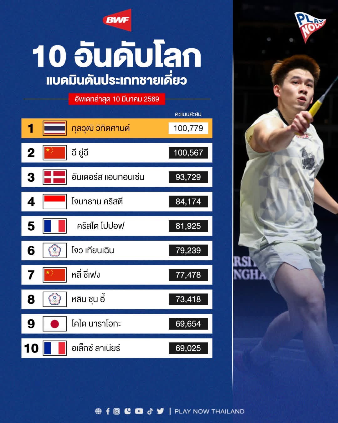 'วิว' ขึ้นมือ 1 โลก!! แบดมินตันชายเดี่ยวไทย ผงาดที่ 1 โลกอีกครั้ง คะแนน 100,779 สูงกว่าจีน พลิกเกมโลกแบดมินตันปี 2026
