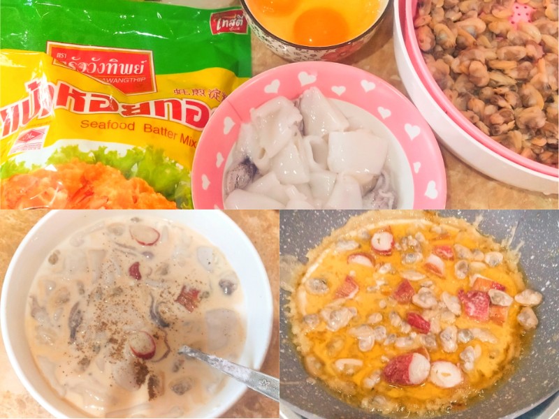 3. ตั้งกระทะใส่น้ำมัน รอจนร้อน ใส่แป้งที่ผสมหอยปลาหมึกปูอัดลงไป