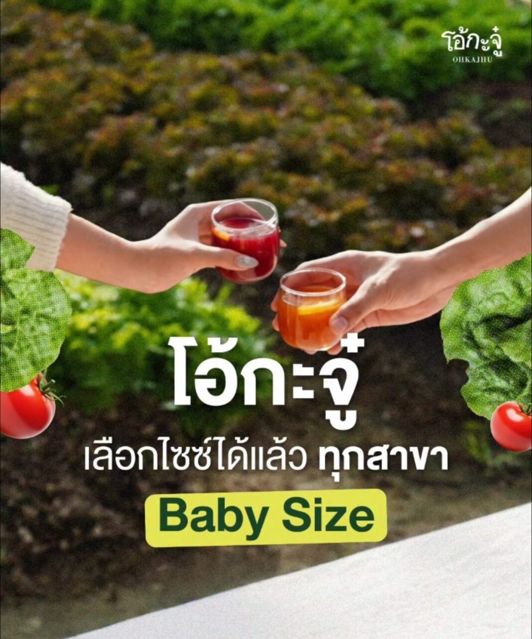 “วันที่ 12 มีนาคมนี้ ทุกสาขา ลูกค้าสามารถเลือกไซซ์ได้แล้ว เป็นsizeเล็กลง อิ่มพอดี ราคาสบายกระเป๋า เพราะอยากดูแลทุกคนเหมือนคนในครอบครัว…จึงตั้งใจมอบทางเลือกใหม่ #BabySize ที่อิ่มพอดีและคุ้มค่าให้คุณได้ทานผักออร์แกนิคสดๆ ได้บ่อยเท่าที่ต้องการ”
