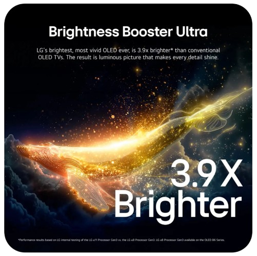 เทคโนโลยี Brightness Booster Ultra ช่วยเพิ่มความสว่างให้กับทีวี OLED ที่สว่างที่สุดของ LG ได้สูงสุดถึง 3.9 เท่า (ยกเว้นรุ่น 97 นิ้ว)