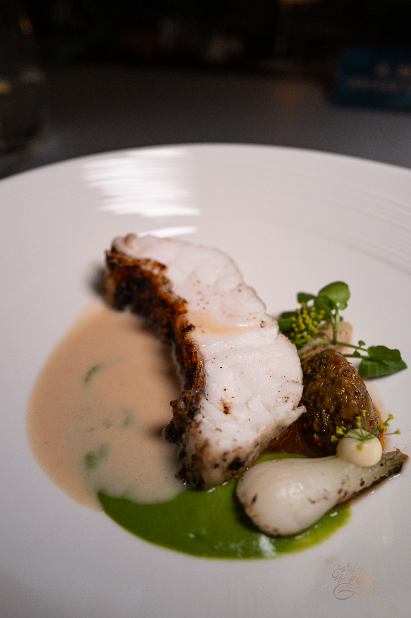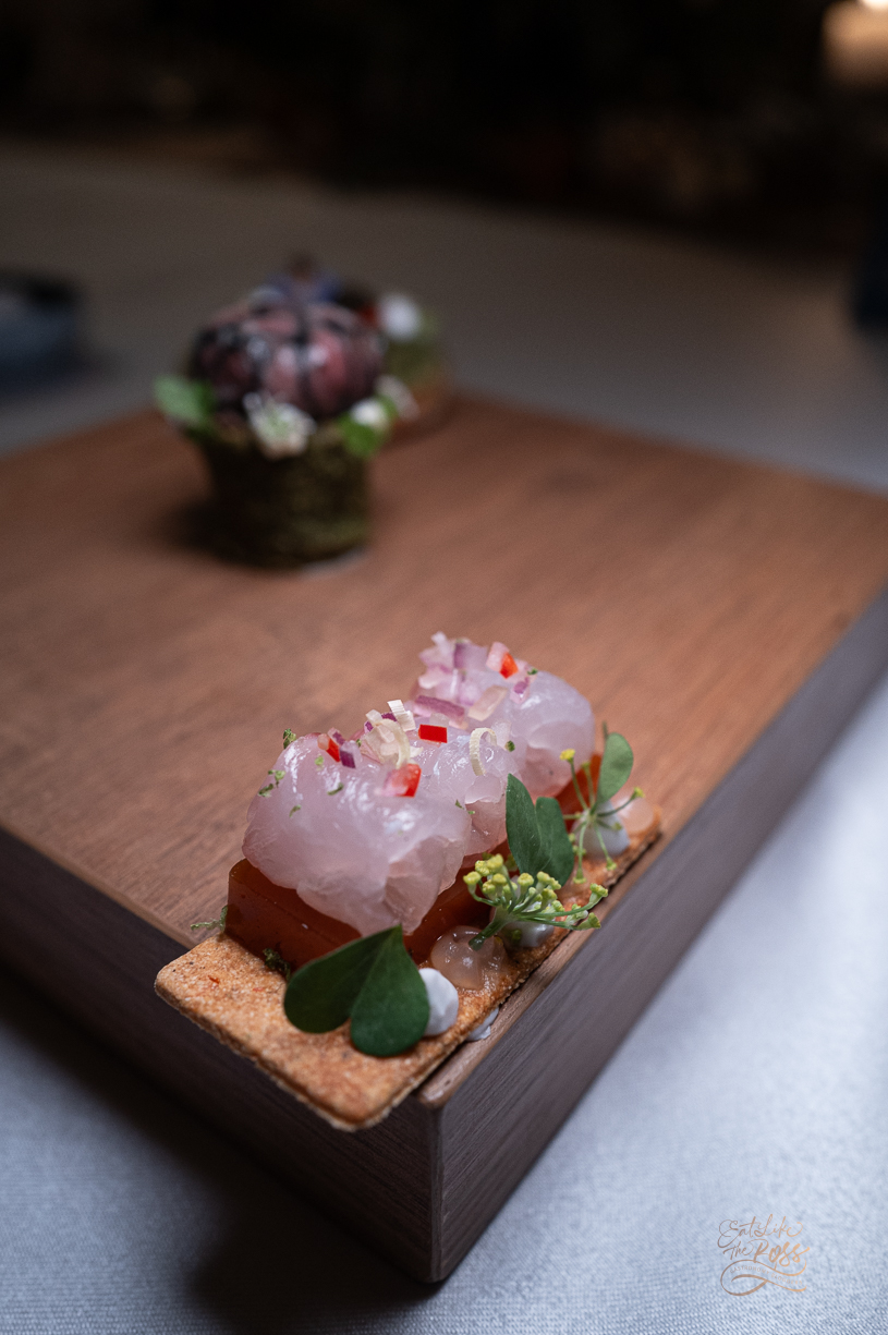 MANGROVE SNAPPER พล่าปลา เปิดมื้อด้วยความสดชื่นจากปลากะพงเขี้ยวเเดงดิบ เสิร์ฟมากับ Aspic น้ำยำ ท็อปด้วยมะพร้าวและ Sorrel แม้ตัวฐานทาร์ตแป้งจะมีความแข็งไปนิด แต่รสชาติคำนี้นั้นเข้มข้นจัดจ้าน กลิ่นเครื่องแกงและซอเรลสร้างมิติใหม่ให้กับอาหารไทยคำนี้ได้อย่างยอดเยี่ยม 🐟