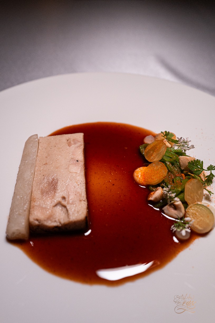 Terrine (เนื้อบดละเอียดอัดแท่ง) ทำจากสะโพกไก่และมูสไก่กับเค้กข้าวเหนียว เสริฟ์มากับซอสชิกเก้นวินิเกรตที่รสชาติเหมือนแจ่ว เป็นเมนูที่หลับตาทานแล้วรู้สึกเหมือนกำลังทานส้มตำไก่ย่างระดับกูร์เมต์ 🐥