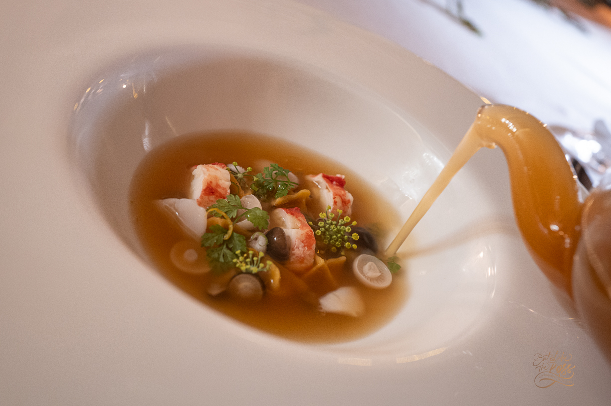 Consommé (ซุปที่ผ่านการเคี่ยวและกรองจนใสสะอาดไร้ตะกอน) อินฟิวด้วยสมุนไพรโป๊ะแตก อัดแน่นด้วยปูทาราบะ หอยนางรมต้มไวน์ เห็ดชิเมจิ และปลาหมึกย่าง รสชาติเปรี้ยวจี๊ดจ๊าดถึงใจ ชนิดที่เรียกว่าทานแล้วตาสว่างทันที 🍋