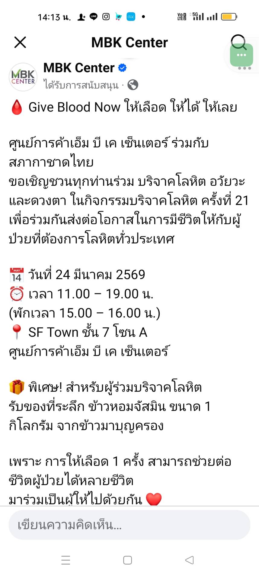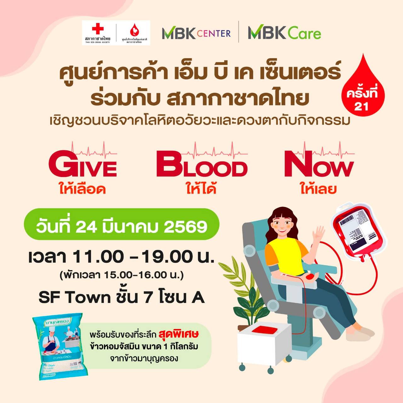 สภากาดชาดไทยรับบริจาคเลือด ที่ศูนย์การค้า เอ็มบีเค เซ็นเตอร์ วันที่24มี.ค.69 นี้ค่ะ