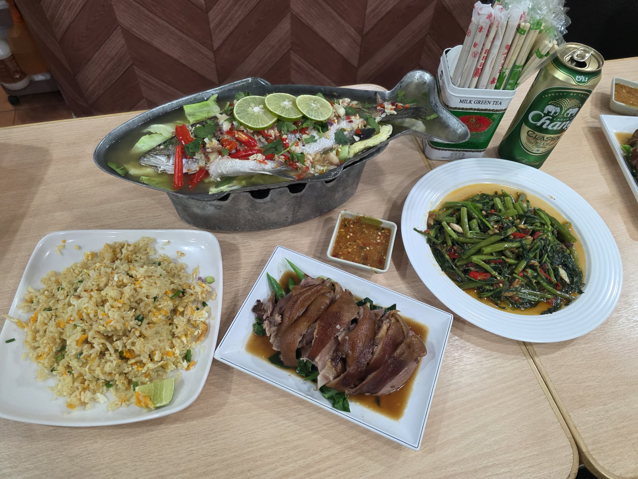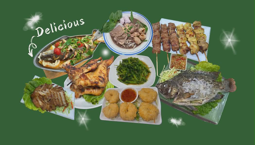 เมนูแนะนำ: ผัดไทย, ต้มยำกุ้ง ปลานิลเผา ลาบหมู คอหมูย้าง และทอดมันกุ้ง