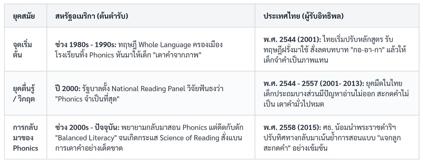 6. ยุคพอดแคสต์ไวรัล และอวสาน Balanced Literacy (ปี 2022 — ปัจจุบัน) — พอดแคสต์ “Sold a Story” แฉระบบเก่า นำไปสู่การแก้กฎหมายในกว่า มากกว่า 40 รัฐ “สั่งแบน” การสอนแบบการเดาคำ และบังคับให้ครูสอนตามหลัก Science of Reading