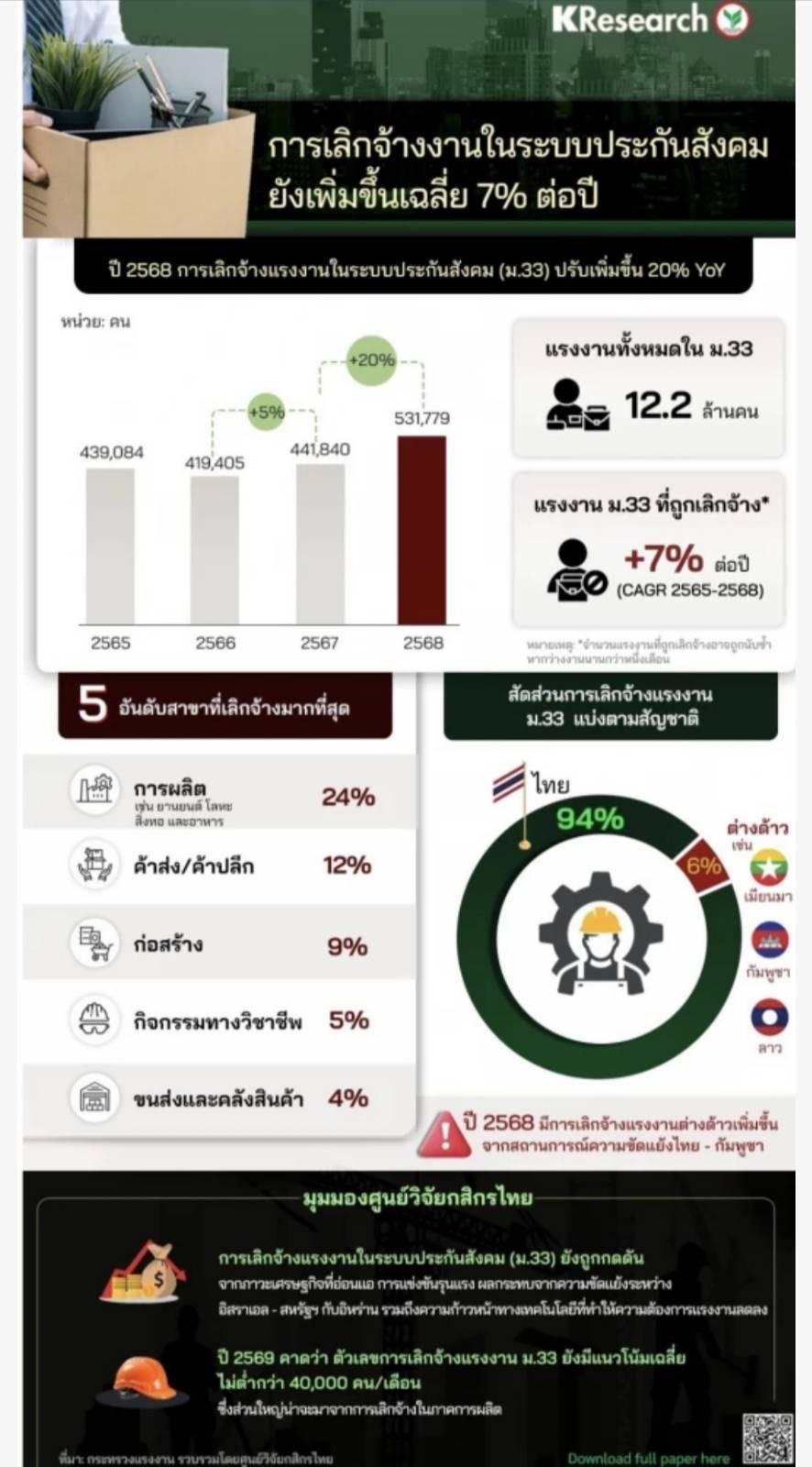เลิกจ้างแรงงานพุ่งไม่หยุด!..คาดปี69..จ่อตกงานเดือนล่ะ 4หมื่นคน