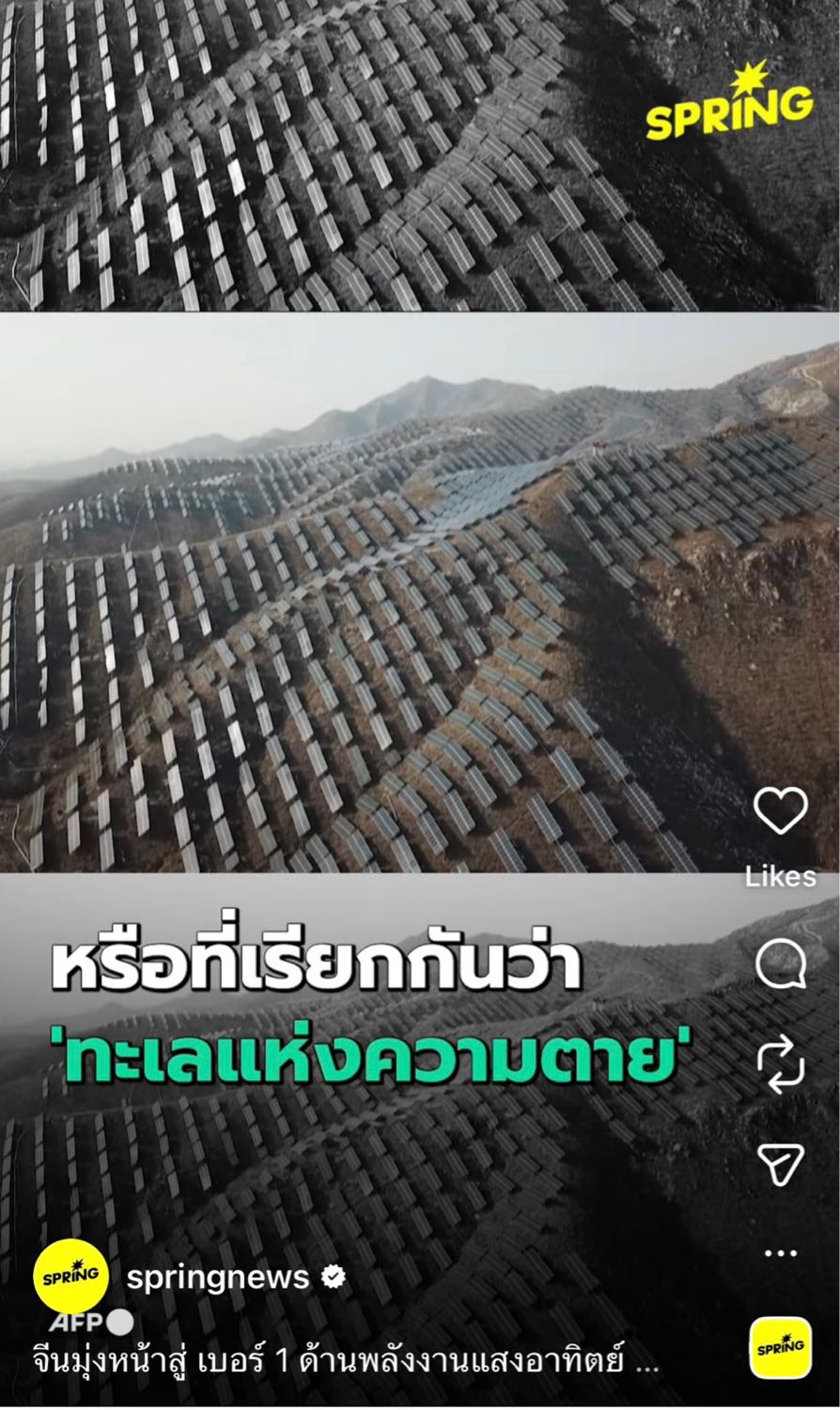 • เปลี่ยน "ทะเลแห่งความตาย" เป็นแหล่งพลังงาน: คำว่า "ทะเลแห่งความตาย" (Sea of Death) มักถูกใช้เรียก ทะเลทรายทากลามากัน (Taklamakan Desert) หรือในบางบริบทหมายถึง ทะเลทรายคู่ปู้ฉี (Kubuqi Desert) ซึ่งเป็นพื้นที่แห้งแล้งและทารุณอย่างมาก แต่ปัจจุบันจีนได้ติดตั้งแผงโซลาร์เซลล์จำนวนมหาศาลเพื่อผลิตไฟฟ้า