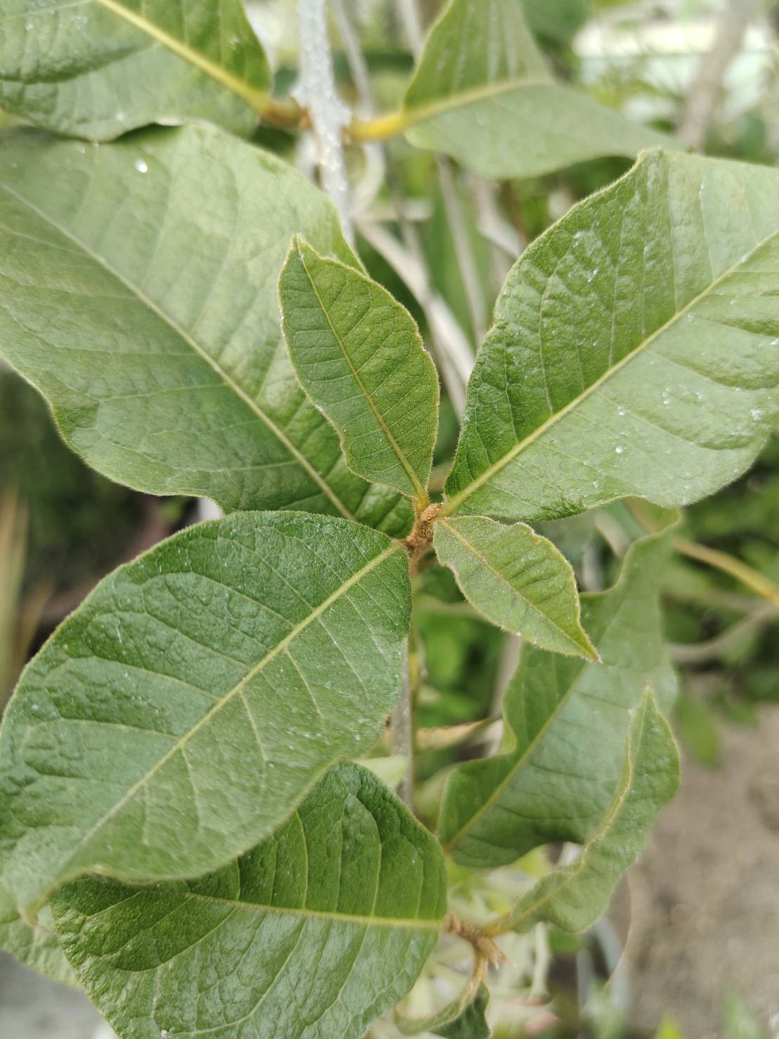 ☘️ ใบ :: เป็นใบเลี้ยงเดี่ยว เรียงตรงข้ามกัน รูปรีแกมรูปขอบขนาน กว้าง 5-7 เซนติเมตร ยาว 8-11 เซนติเมตร ปลายใบแหลม โคนใบสอบมน แผ่นใบค่อนข้างหนาแข็ง ขอบใบเรียบ ผิวใบด้านบนสีเขียวเข้ม ด้านล่างสีจางกว่าและผิวใบมีขนสากปกคลุม