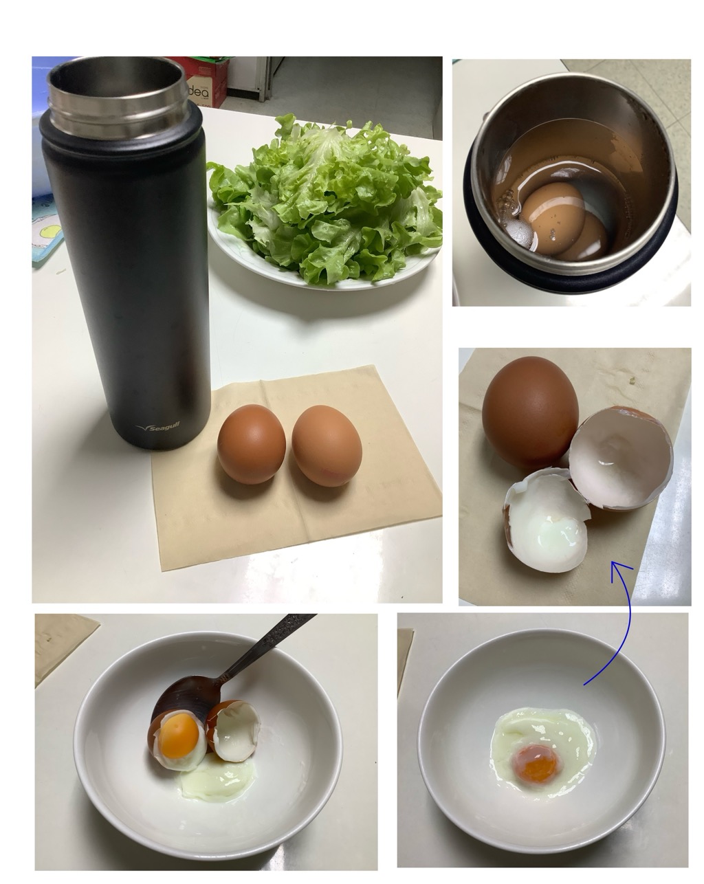 เนื่องจากได้กระบอกเก็บอุณหภูมิมาหลายอันจนใช้ไม่ทัน (ทั้งใช้ที่ออฟฟิศ ที่บ้าน แจกต่อคนรอบข้างแล้ว ก็ยังมีเหลือ) ก็เลยนึกได้ถึงวิธีต้มไข่ (ลวกก็ว่าได้) ที่เคยอ่านเจอจากในกระทู้ของห้องก้นครัวนี้ครับ (ขออภัย หาไม่เจอว่าผมอ่านจากกระทู้ไหน ไม่งั้นจะให้เครดิตไปแล้ว กระทู้ต้นฉบับบอกว่า แช่ไข่ในชามก่อนมื้ออาหาร)