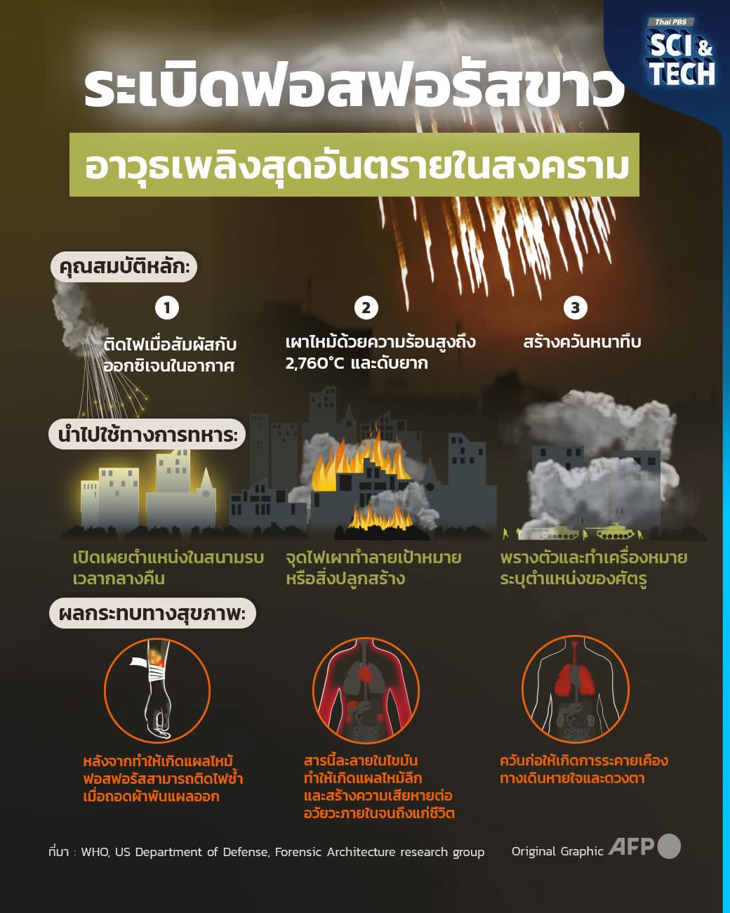 "ฟอสฟอรัสขาว" #WhitePhosphorus เป็นสารเคมีที่เป็นของแข็งคล้ายขี้ผึ้ง มักมีสีเหลืองหรือไม่มีสี มีกลิ่นคล้ายกระเทียม และติดไฟทันทีเมื่อสัมผัสกับออกซิเจน ทางการทหารมักใช้เพื่อส่องสว่างในสนามรบ สร้างม่านควัน และเป็นสารไวไฟ เพราะเมื่อติดไฟแล้ว ฟอสฟอรัสขาวจะดับยากมาก สารจะเกาะติดกับพื้นผิวต่าง ๆ เช่น ผิวหนังและเสื้อผ้า