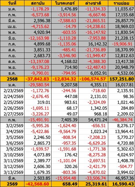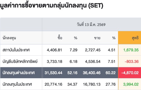 Sinthorn Summary 13/3/2569 : ต่างชาติขายสุทธิ -4,870.02 ลบ.
