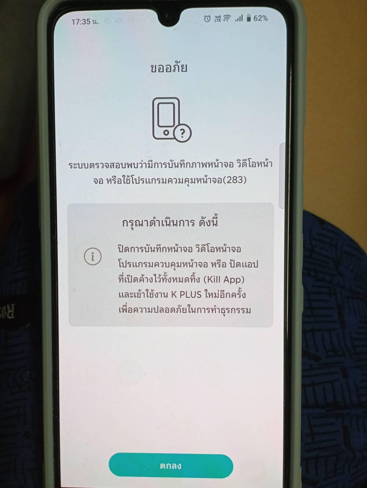 แอป K+ ทำไมขึ้นข้อความว่าตรวจพบการบันทึกหน้าจอ และเข้าไม่ได้ครับ