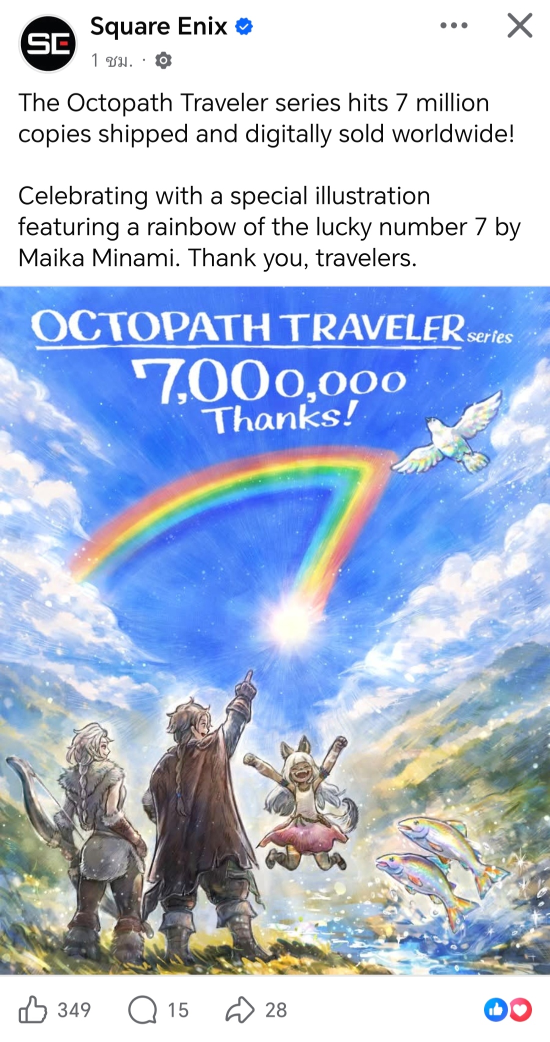 ล่าสุด square enix ประกาศว่า ยอดขายซีรีส์ OCTOPATH TRAVELER ตอนนี้รวมได้ 7 ล้านชุดทั่วโลกแล้วครับ