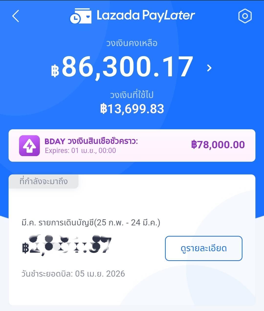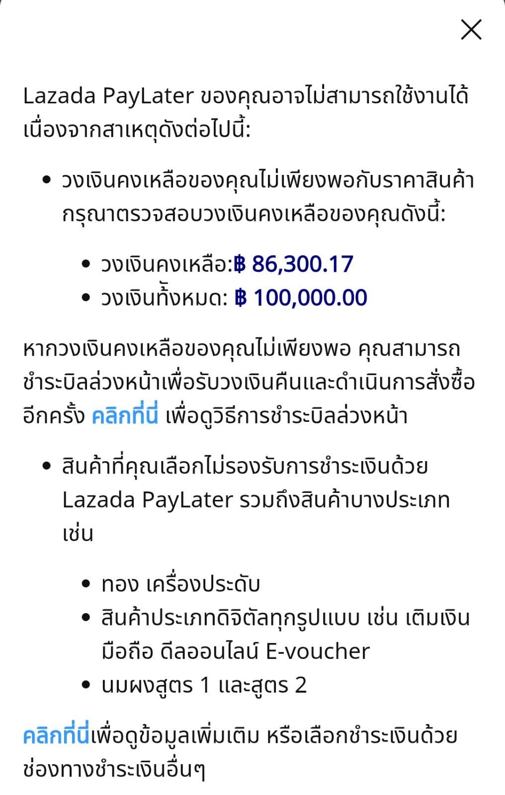 ใช้มานานแล้ว และไม่เคยจ่ายเลยกำหนดเลยสักครั้ง แต่ต่อมามีสินเชื่อ FastCash เพิ่มมาเลยลองกดใช้ดู ไม่รู้ยังไงลืมจ่าย!!!! งวดแรก เลยวันจ่ายมา 1 วันมีเจ้าหน้าทีโทรมาทวง พอวางเสร็จก็จ่ายเลย และสักพัก Lazada PayLater ก็ไม่สามารถใช้ได้ คือไม่ได้ขึ้นว่าระงับหรืออะไรนะ แต่กดจ่ายสินค้า เลือกจ่ายผ่าน LazPayLater ก็กดจ่ายไม่ได้ (ขึ้นจางๆ) ลองสินค้าหลายอย่างแล้วจ่ายไม่ได้ ขึ้นที่หน้าจ่ายว่า "ขออภัย ไม่สามารถใช้ Lazada PayLater ได้กับสินค้าในคำสั่งซื้อนี้ " งงเลย 😅