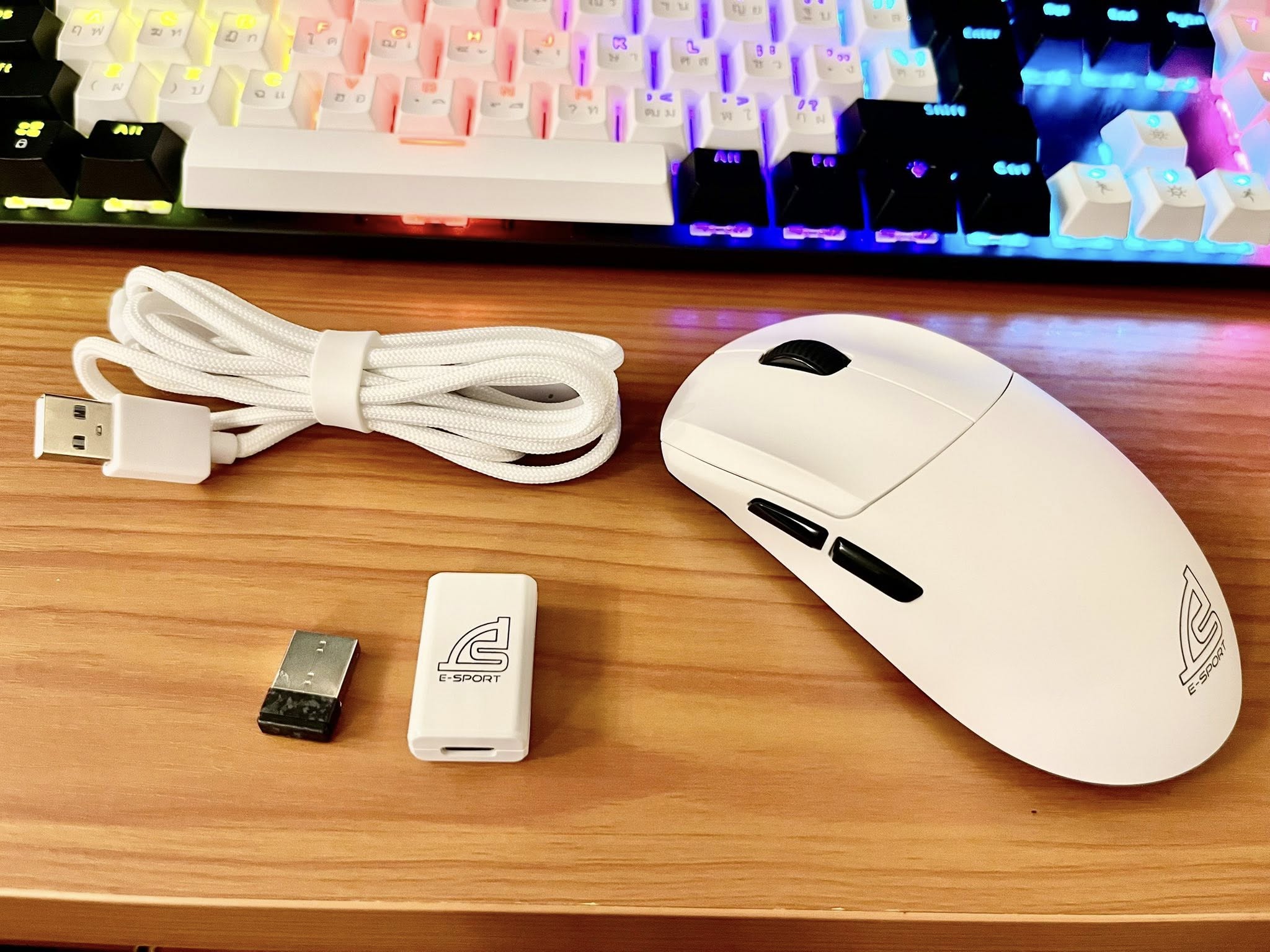 ตอนที่แกะกล่องและหยิบตัวเมาส์ขึ้นมาครั้งแรก ความรู้สึกแรกที่พุ่งเข้ามาเลยคือมันเบามากครับ ด้วยน้ำหนักตัวเพียงแค่ 58 กรัม ทำให้เวลาเราจับสะบัดเมาส์หรือลากเล่นเกมเร็วๆ มันแทบจะไม่รู้สึกถึงแรงต้านเลยครับ ตัวบอดี้เป็นพลาสติกคุณภาพดี งานประกอบทำมาได้แน่นหนา ไม่มีความรู้สึกก๊องแก๊งเลยแม้แต่น้อย ดีไซน์ของเขามาในรูปแบบทูโทน ดำตัดขาว ดูสวยงามมินิมอลมากๆ (มีตัวเลือกสีดำด้วยนะครับ แต่ผมชอบสีขาวมากกว่า) แถมด้านข้างยังมีการสกรีนโลโก้คำว่า Ultra-Lightweight เอาไว้ด้วย ช่วยเพิ่มความเท่และทำให้ตัวเมาส์ดูมีคลาสขึ้นมาอีกระดับเลยครับ นอกจากนี้ของที่แถมมาในกล่องก็จัดเต็มสุดๆ ทั้งสายชาร์จแบบผ้าถักคูรภาพสูงสีขาวที่นุ่มพลิ้ว ตัวอแดปเตอร์ Dongle รับสัญญาณ และที่ผมชอบความใส่ใจของแบรนด์มากๆ คือเขามีแผ่นฟีดเมาส์ (Mouse Feet) สำรองแถมมาให้ด้วยครับ เรียกว่าซื้อกล่องเดียวจบพร้อมลุยเลย