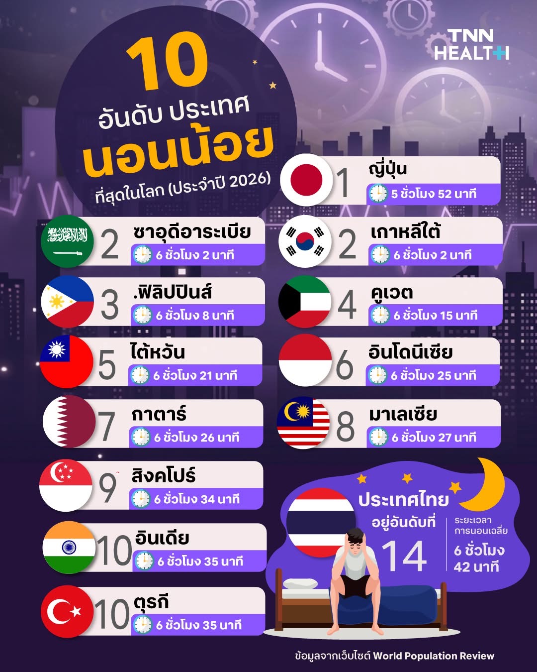 นี่คือ 10 อันดับประเทศที่นอนน้อยที่สุดในโลก ประจำปี 2026 ค่ะ