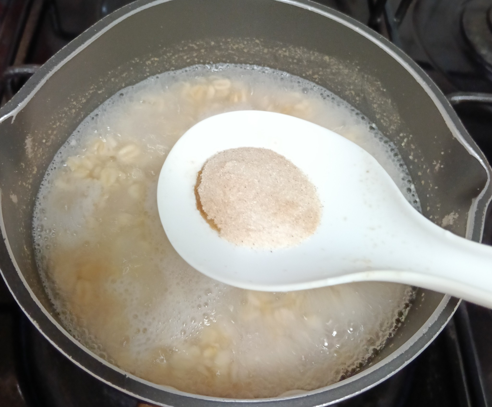- พอข้าวโอ๊ตก็ใส่ผงซุปปลาลงไป ปรุงรสด้วยซีอิ๊วขาวเพิ่มนิดหน่อย