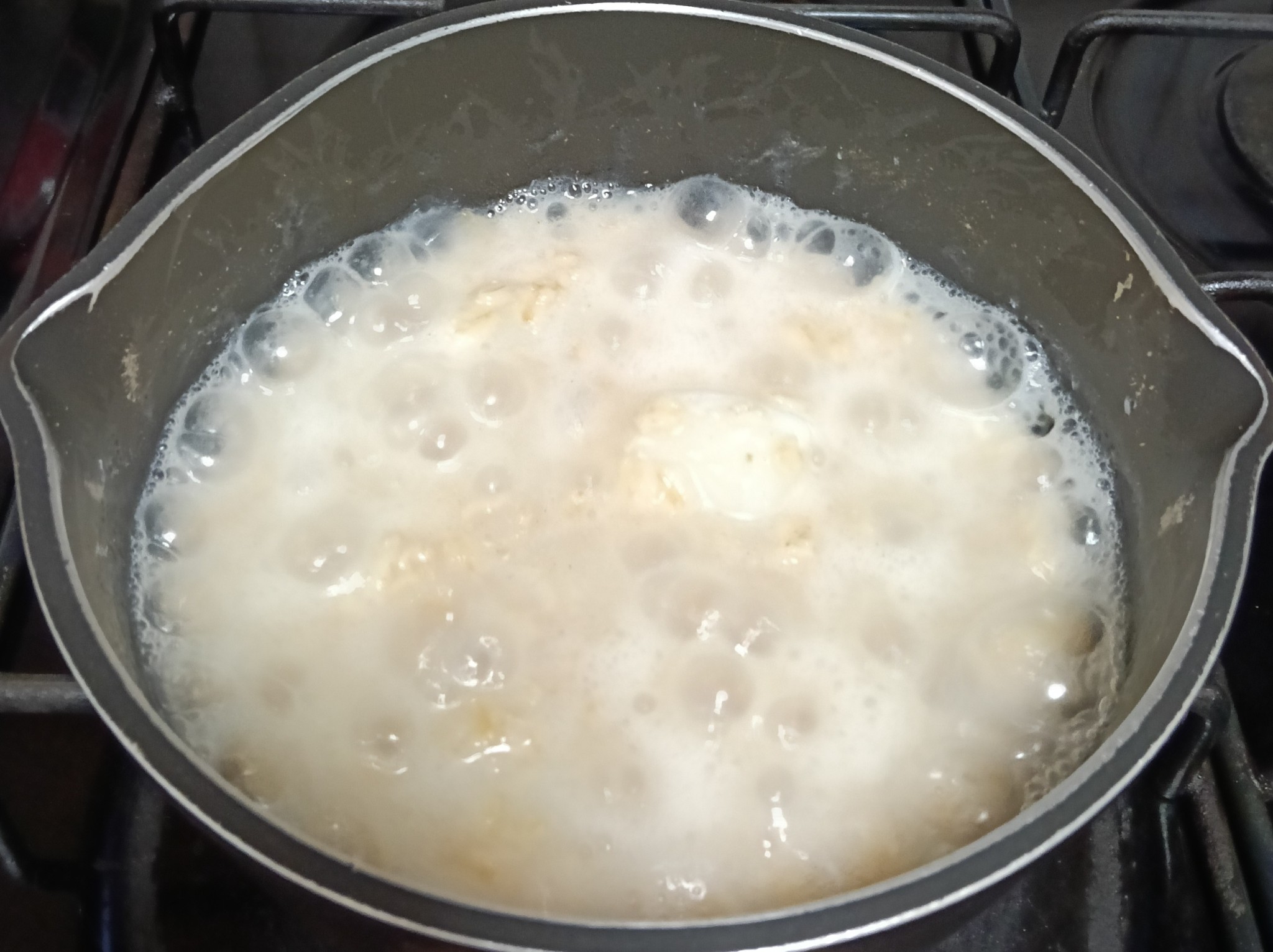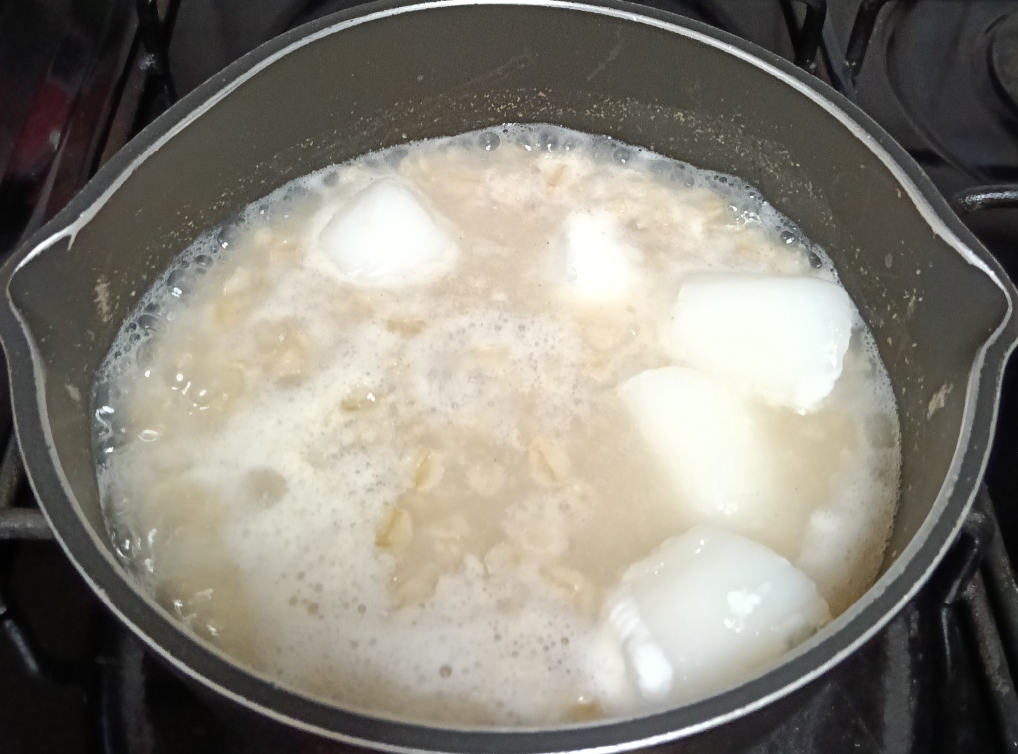 ใส่ข้าวโอ๊ตลงไป หมั่นคนอยุ่เรื่อยๆ เพราะข้าวโอ๊ตมียางเยอะจะเหนียวติดก้นหม้อ