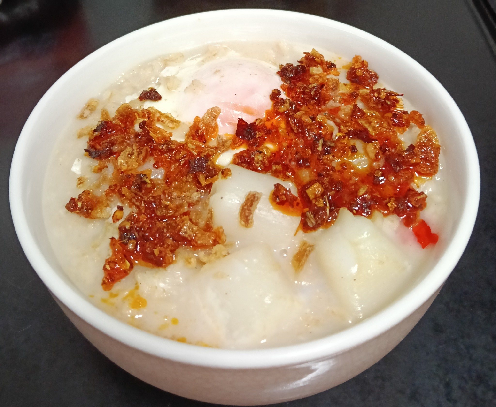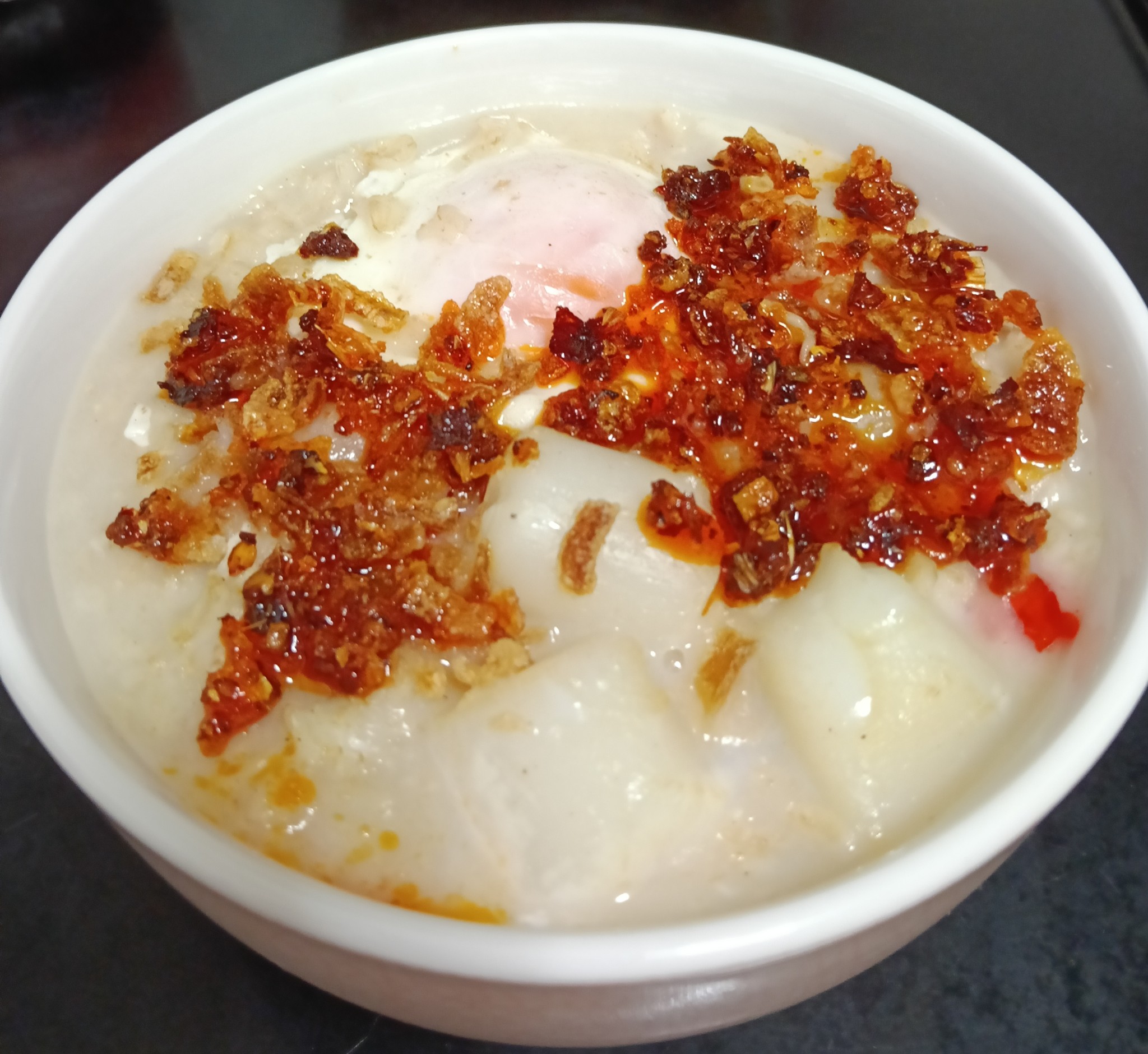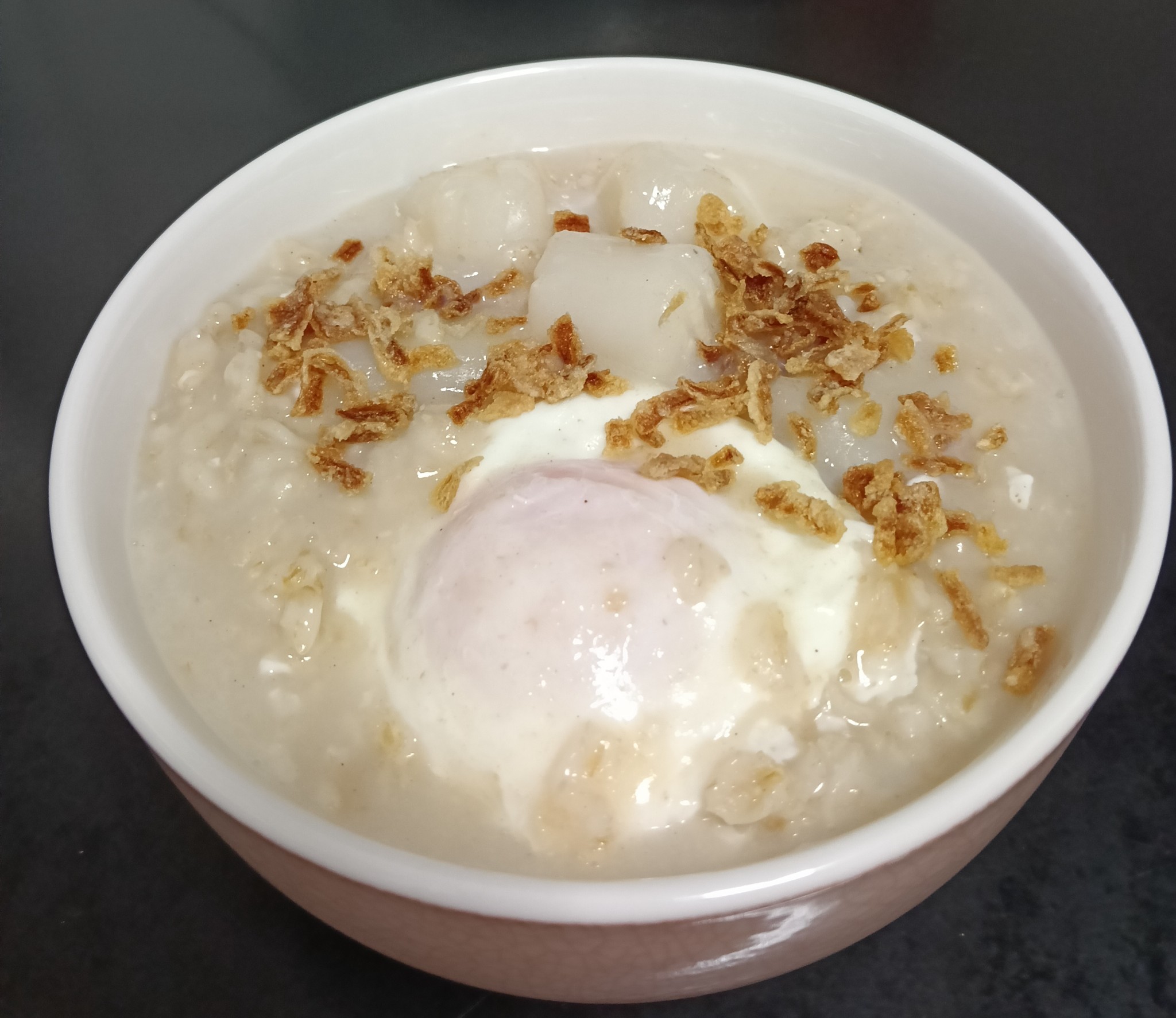 "ข้าวต้มข้าวโอ๊ตหอยเชลล์🍚🍲🥣🥚🐚🐚🧄🌶️🌶️"