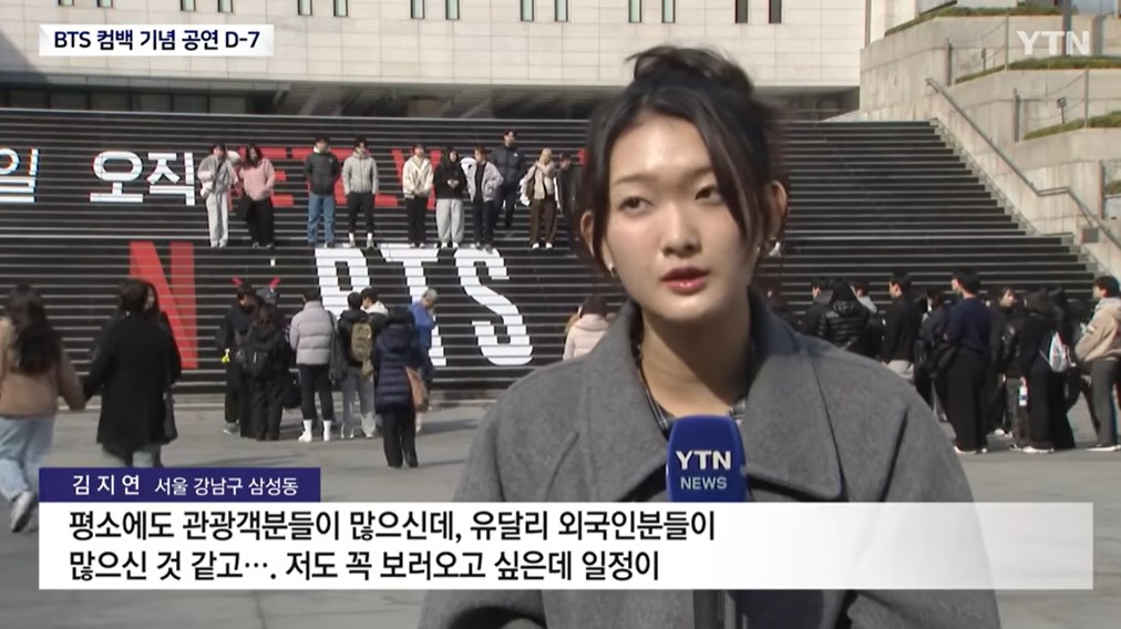 นาตาลยา ( อายุ 32 ปี) ที่เดินทางมาจากรัสเซียเพื่อมาเที่ยวคยองจูกับพ่อแม่ กล่าวว่า “น่าเสียดายที่ฉันไม่ได้ตั๋วคอนเสิร์ต BTS แต่ฉันจะกลับมาที่กวางฮวามุนในวันคอนเสิร์ตเพื่อสัมผัสบรรยากาศอย่างน้อยที่สุด”