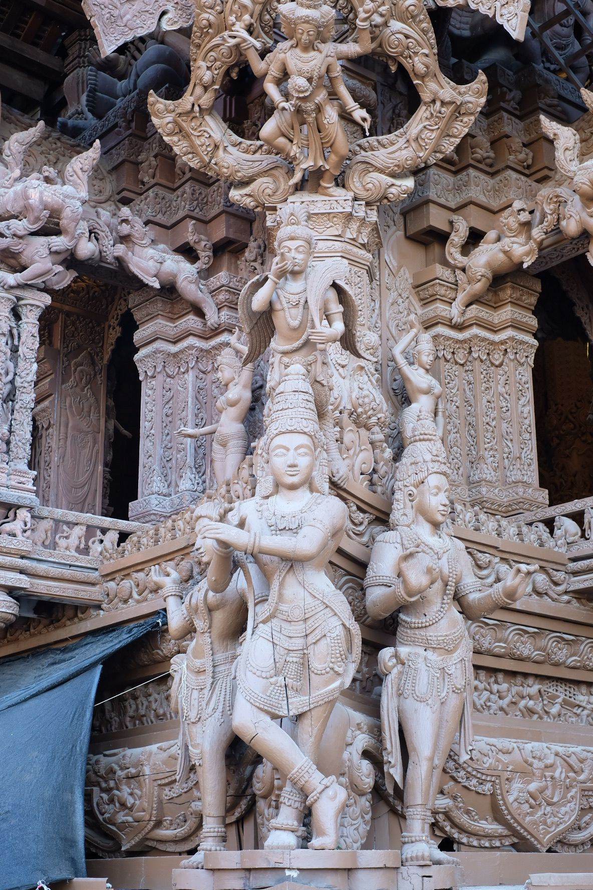 ภายในและภายนอกปราสาทมีประติมากรรมไม้แกะสลัก มากกว่าพันชิ้น แต่ละชิ้นมีความหมายเชิงปรัชญา เช่น เทวดา เทพฮินดู สัตว์ในตำนาน