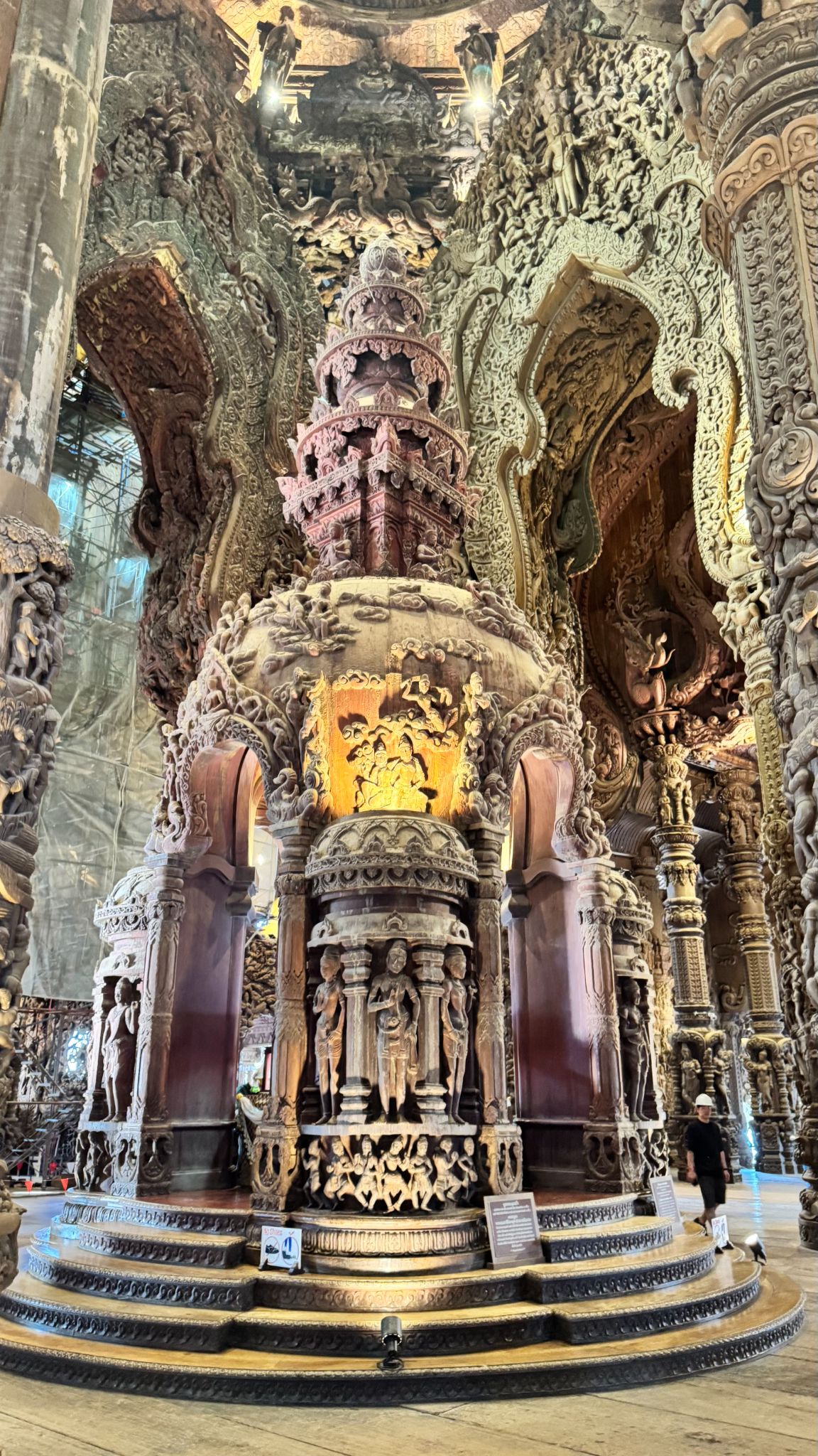 ใส่หมวกนิรภัย เพราะยังมีการซ่อมและแกะสลักไม้ต่อเนื่องอยู่