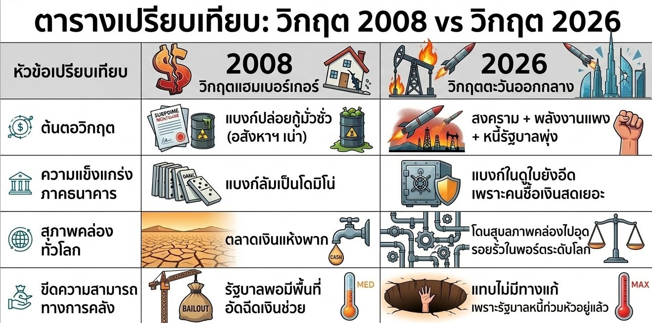 ตารางเปรียบเทียบ วิกฤต 2008 vs วิกฤต 2026
