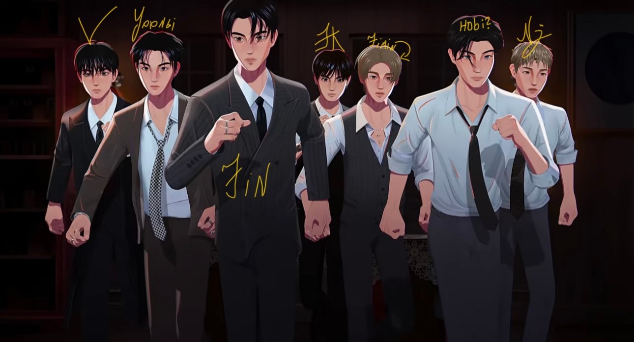 เวอร์ชันแอนิเมชันของ BTS — RM, Jin, SUGA, J-Hope, Jimin, V และ Jung Kook — ยืนล้อมรอบเครื่องเล่นแผ่นเสียงโบราณ (Gramophone) หยิบชิ้นส่วนของดนตรีและใส่เข้าไปในเครื่อง