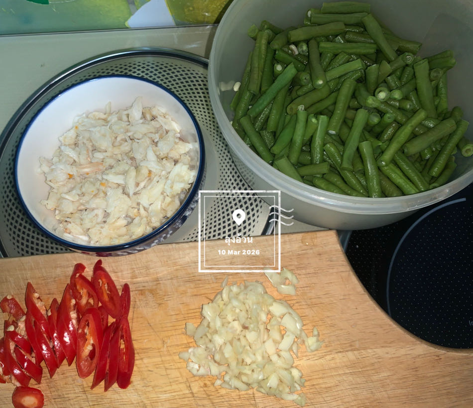 วัตถุดิบ: เนื้อปูแกะ, ถั่วฝักยาวลวกหั่นท่อน:หั่นท่อนพอดี, พริกจินดาแดงหั่นแฉลบ, กระเทียมสับ:เพิ่มความหอมเครื่องปรุง (แบบจืด):น้ำมันหอยโซเดียมต่ำ (นิดหน่อย) และน้ำเปล่า