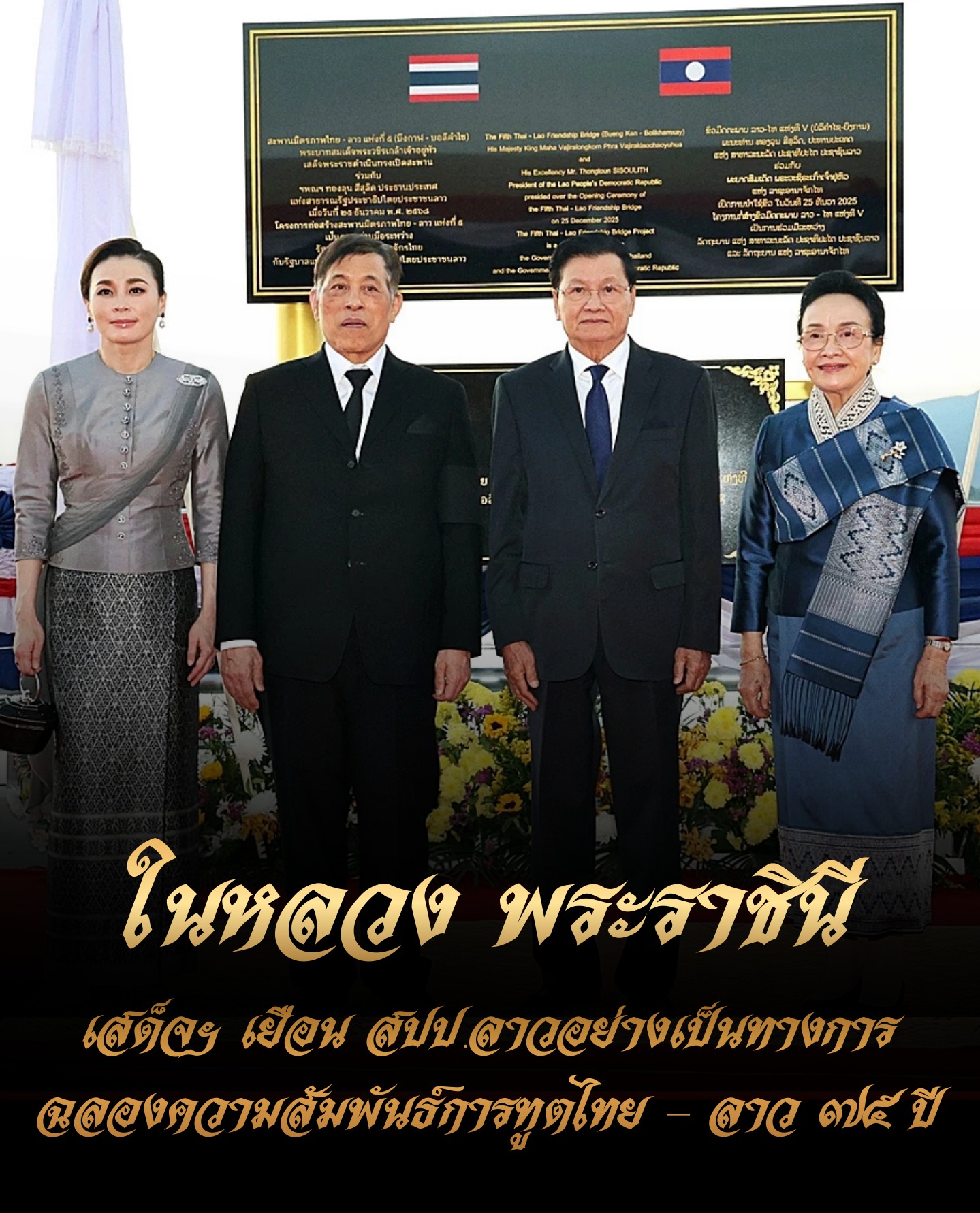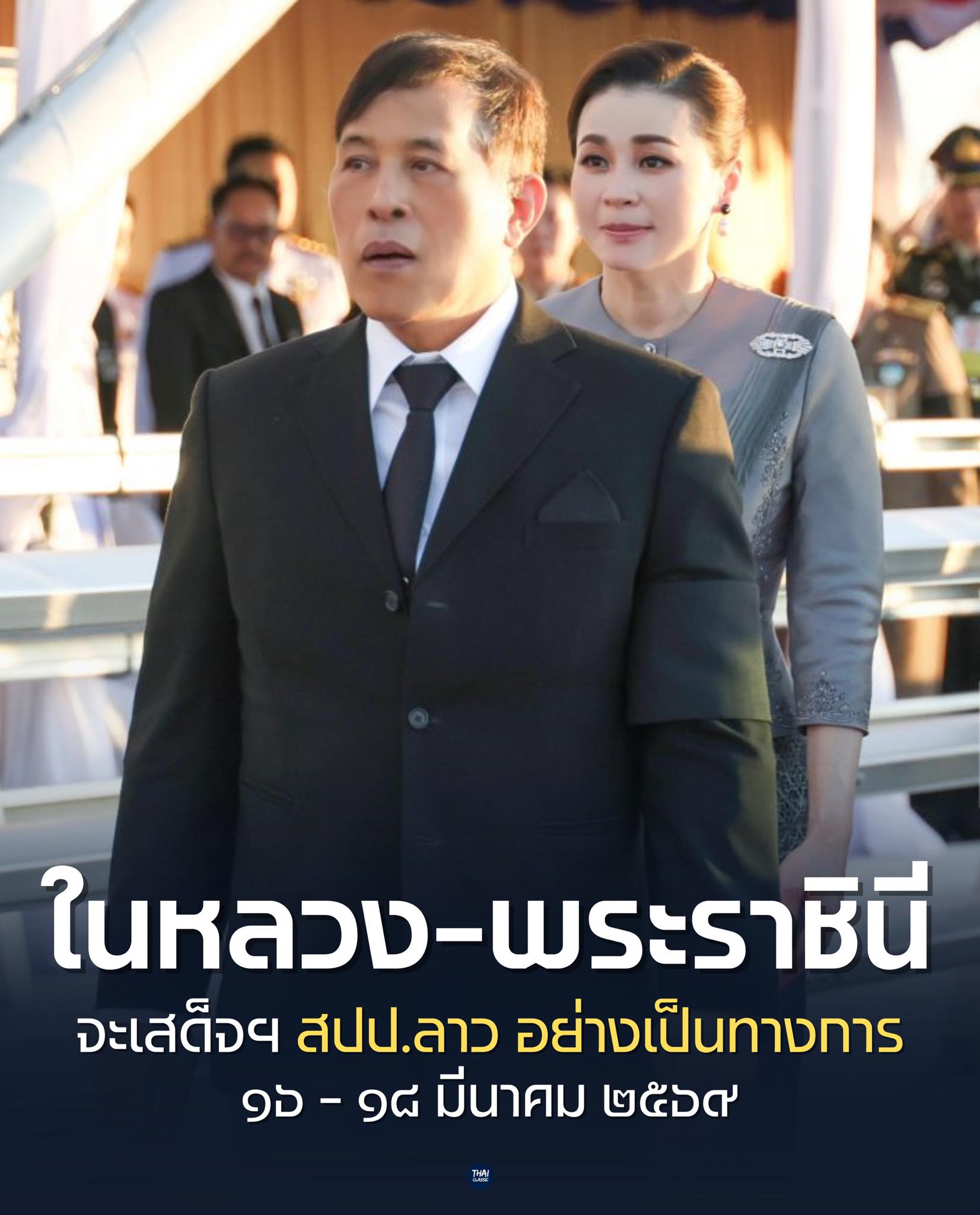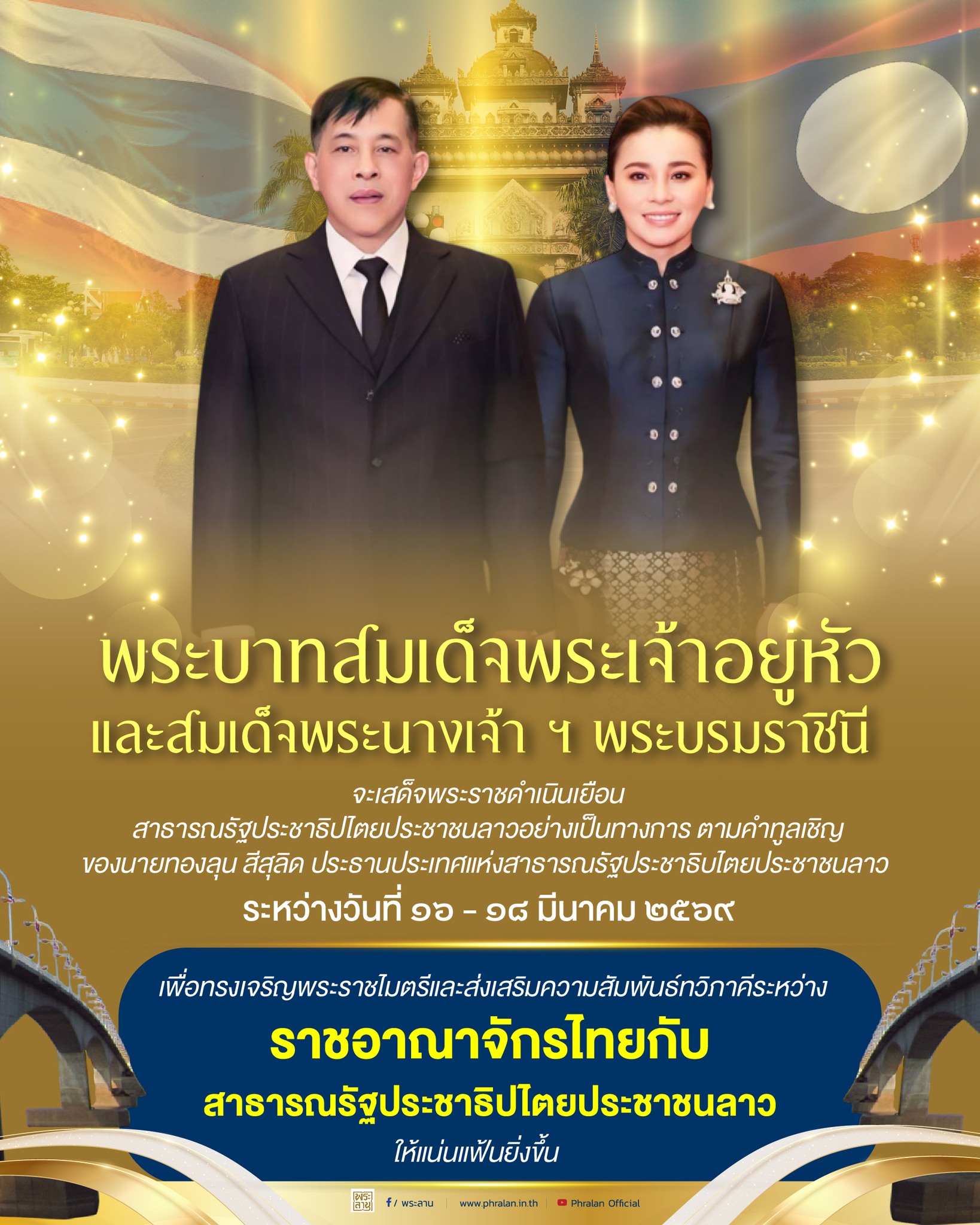 พระบาทสมเด็จพระเจ้าอยู่หัวและสมเด็จพระนางเจ้า ฯ พระบรมราชินี จะเสด็จพระราชดำเนิน เยือนสาธารณรัฐประชาธิปไตยประชาชนลาวอย่างเป็นทางการ ระหว่างวันที่ ๑๖ ถึงวันที่ ๑๘ มีนาคม พุทธศักราช ๒๕๖๙ ตามคำทูลเชิญของนายทองลุน สีสุลิด ประธานประเทศแห่งสาธารณรัฐประชาธิปไตยประชาชนลาว การเสด็จพระราชดำเนินเยือนในครั้งนี้นับเป็นส่วนหนึ่งแห่งวาระการเฉลิมฉลองการสถาปนาความสัมพันธ์ทางการทูตไทย-ลาว ครบ ๗๕ ปี ในปีพุทธศักราช ๒๕๖๘ และจะเป็นการกระชับสายสัมพันธ์และความร่วมมืออันเข้มแข็งระหว่างประเทศทั้งสอง ในฐานะมิตรประเทศเพื่อนบ้านที่ใกล้ชิดสนิทสนมยิ่งและมีวัฒนธรรมประเพณีที่มีความคล้ายคลึงกัน ให้แน่นแฟ้นยิ่งขึ้น