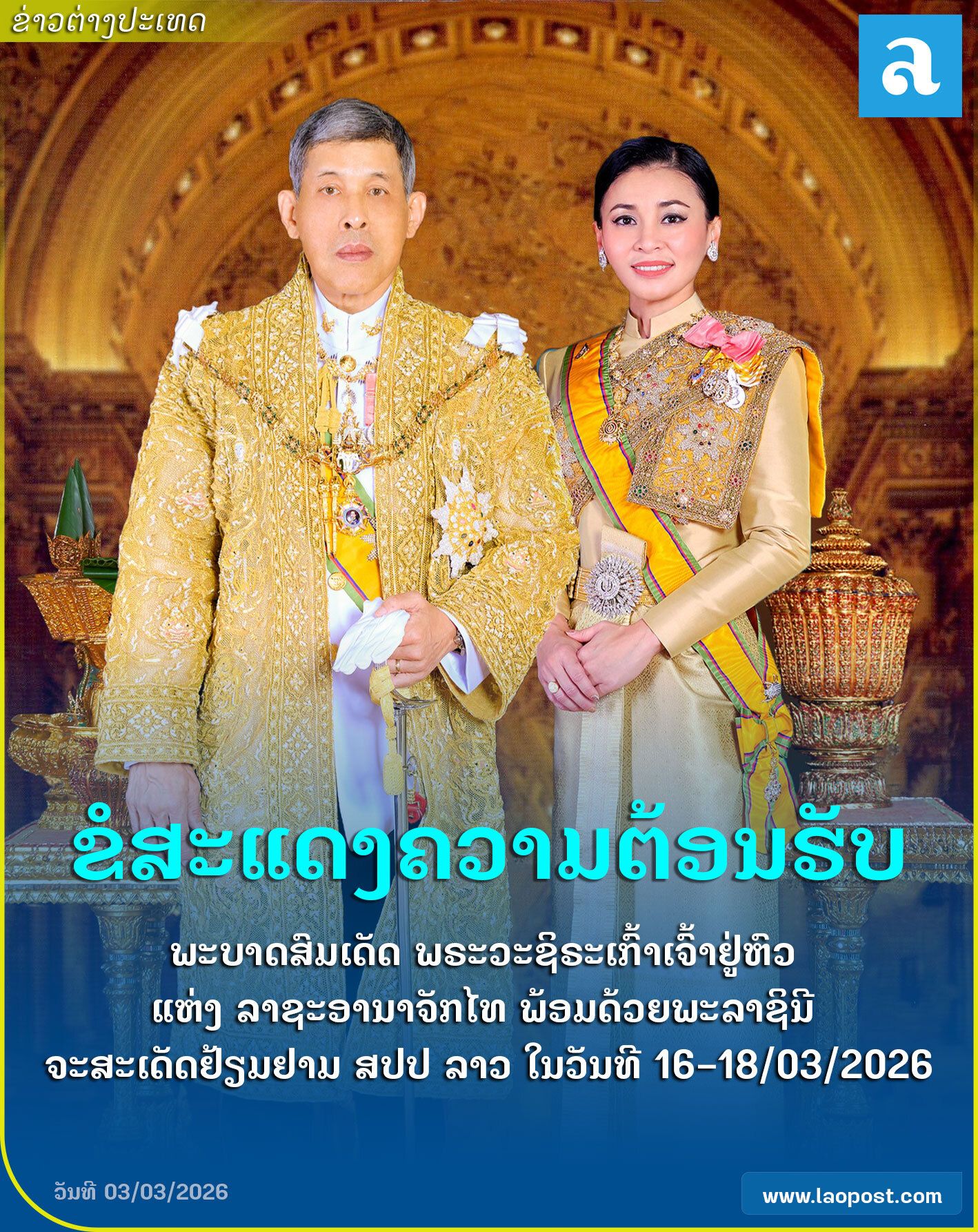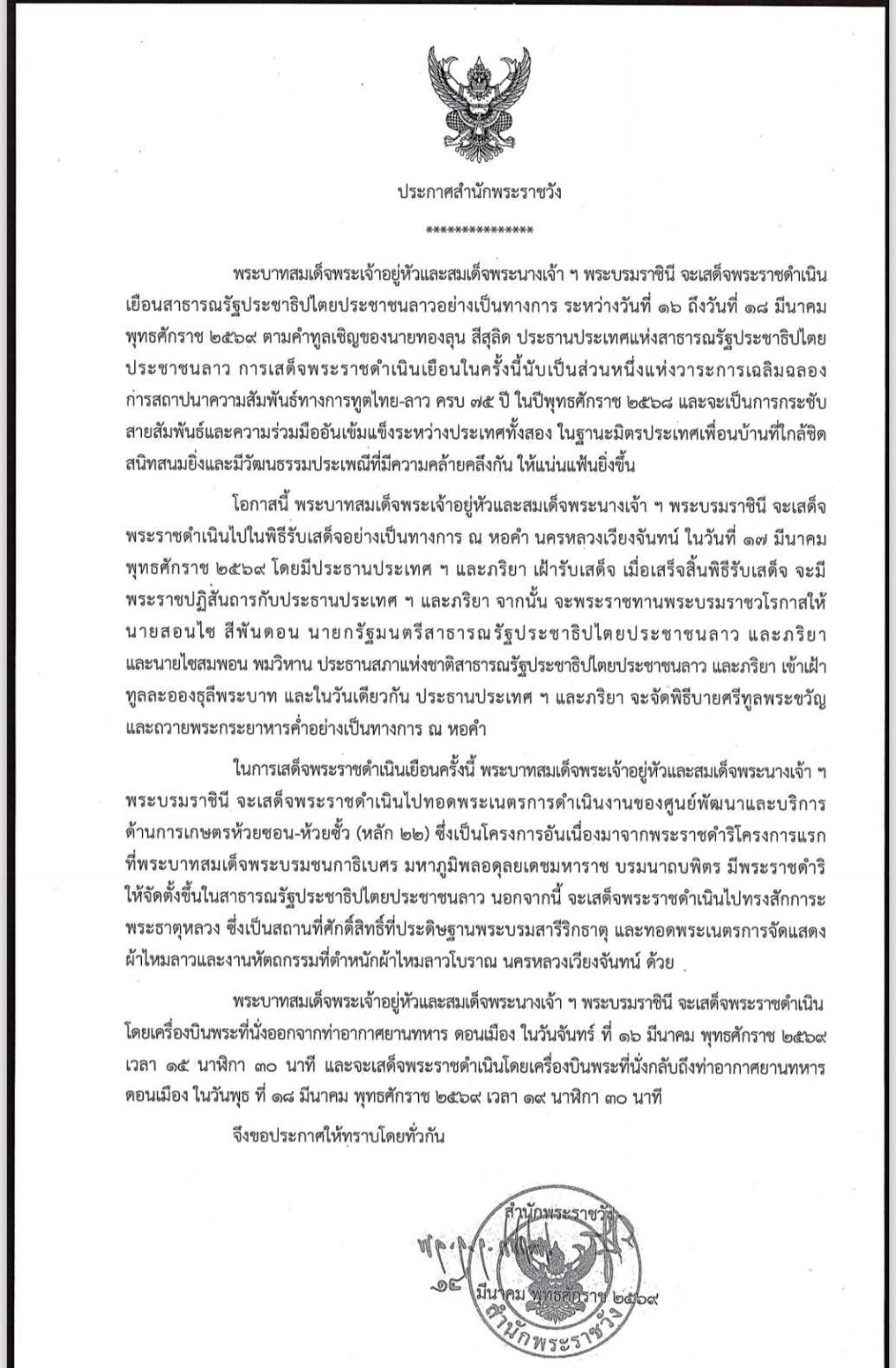 💛💜🙏 ประกาศสำนักพระราชวัง “ในหลวง-พระราชินี” เสด็จฯ เยือน สปป.ลาว อย่างเป็นทางการ ระหว่างวันที่ ๑๖ - ๑๘ มีนาคม ๒๕๖๙ 🙏