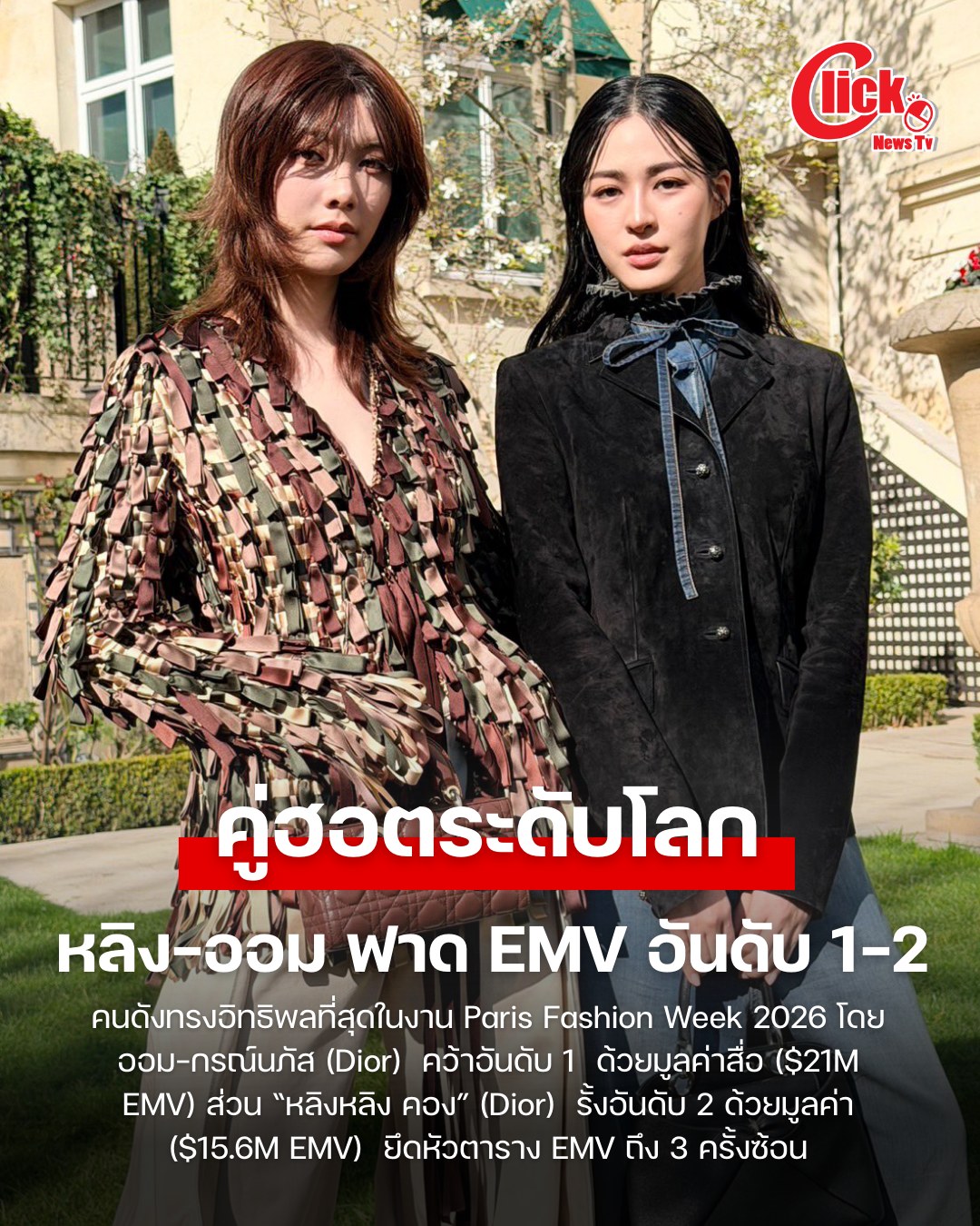 ยังคงสร้างปรากฏการณ์อย่างต่อเนื่อง สำหรับ 2 สาวสุดฮอต “หลิงหลิง–ศิริลักษณ์ คอง” และ “ออม–กรณ์นภัส เศรษฐรัตนพงศ์” หลังแพลตฟอร์มวิเคราะห์ข้อมูลแฟชั่นระดับโลก Lefty เปิดผลสำรวจแบรนด์และคนดังที่สามารถสร้างมูลค่าเพิ่มทางสื่อ Earned Media Value (EMV) ได้สูงที่สุดในช่วง Paris Fashion Week Autumn/Winter 2026 พบว่าภาพรวมกระแสปารีสแฟชั่นวีค 2026 บนโลกโซเชียลฯลดลง 20% เมื่อเทียบกับปี 2025
