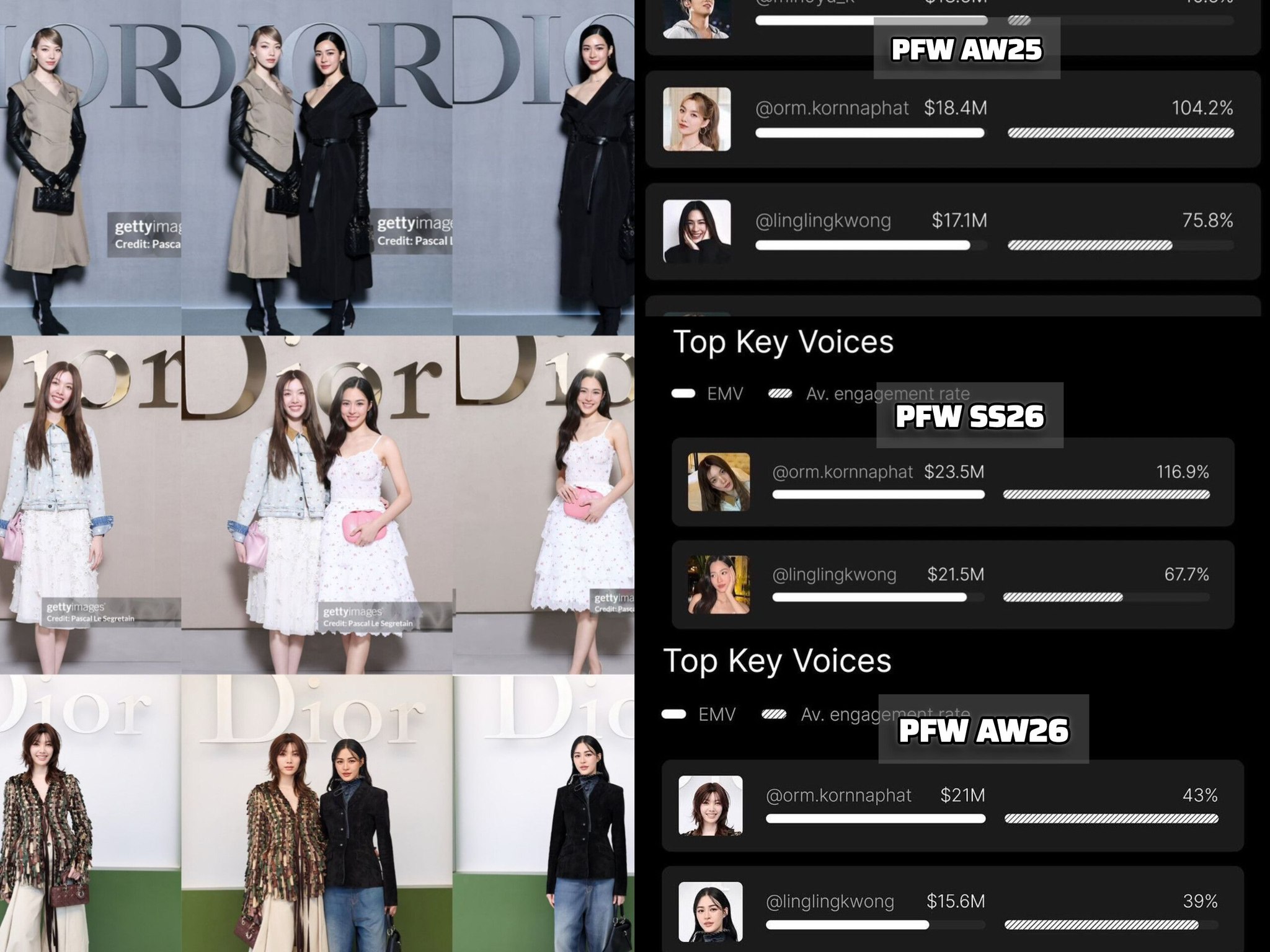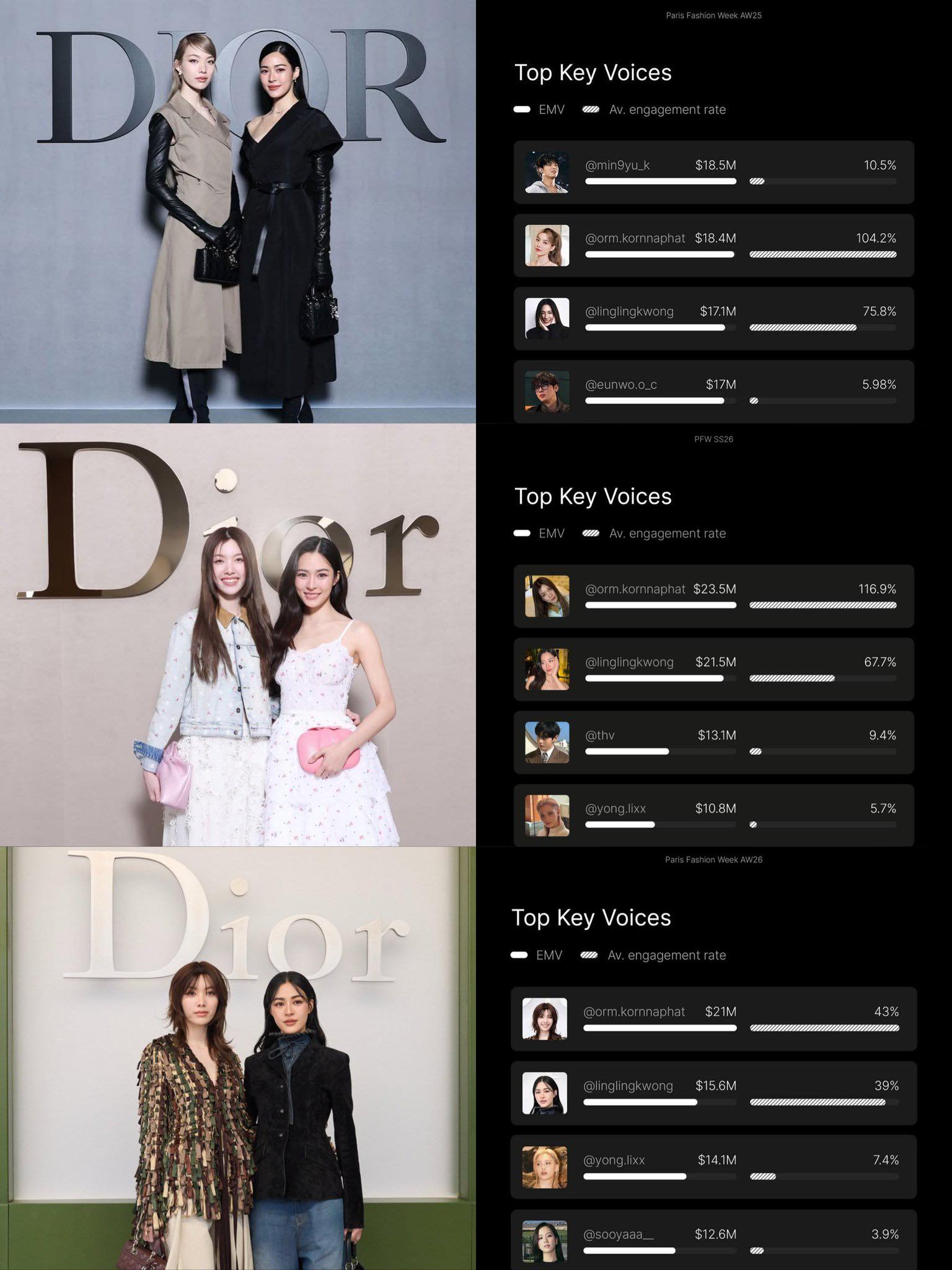 ความสำเร็จครั้งนี้ยังตอกย้ำพลัง Soft Power ของคนไทยบนเวทีแฟชั่นโลก เมื่อ “หลิงหลิง–ออม” สามารถครองตำแหน่งหัวตาราง EMV ได้ต่อเนื่องถึง 3 ครั้งซ้อน หรือ ทุกครั้งที่เยือนแฟชั่นวีค สะท้อนอิทธิพลของศิลปินไทยที่กำลังเปล่งประกายในอุตสาหกรรมแฟชั่นระดับโลกอย่างแท้จริง