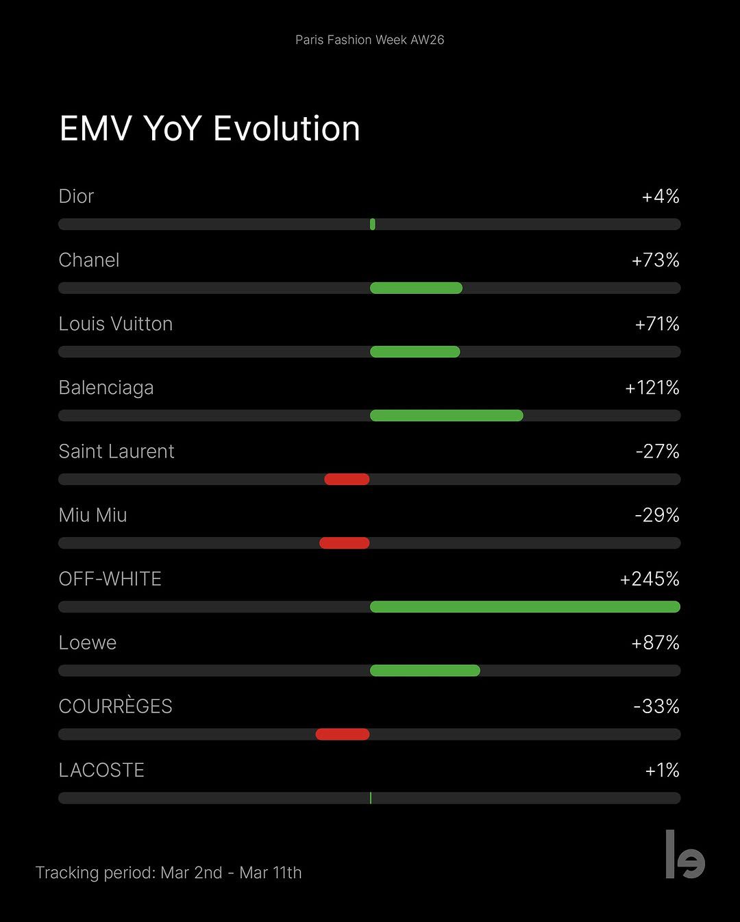 ขณะที่แบรนด์ DIOR ยังคงครองอันดับ 1 ของแบรนด์ที่สร้างมูลค่าสื่อสูงสุด ด้วยตัวเลข 88 ล้านดอลลาร์สหรัฐ ส่วน OFF-WHITE กลายเป็นแบรนด์ที่เติบโตแรงที่สุดของฤดูกาล โดยพุ่งสูงถึง 245% เมื่อเทียบกับปีก่อน