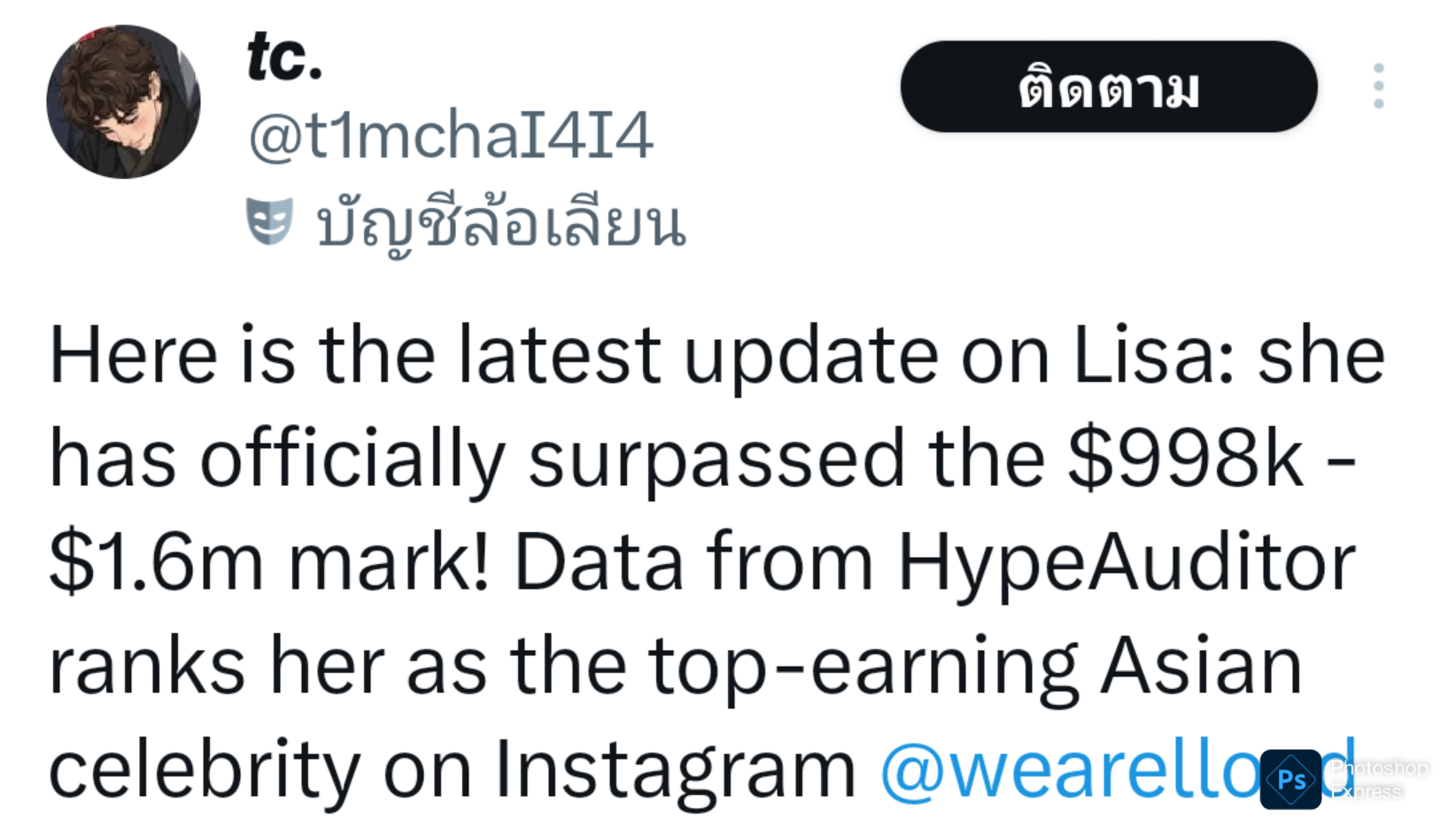 ข้อมูลล่าสุดจากเว็บ HypeAuditor ระบุว่า LISA มีมูลค่าต่อโพสต์สูงแบบก้าวกระโดด 1.6 ล้านเหรียญสหรัฐประมาณกว่า 51 ล้านบาท มีติ่งบางวง