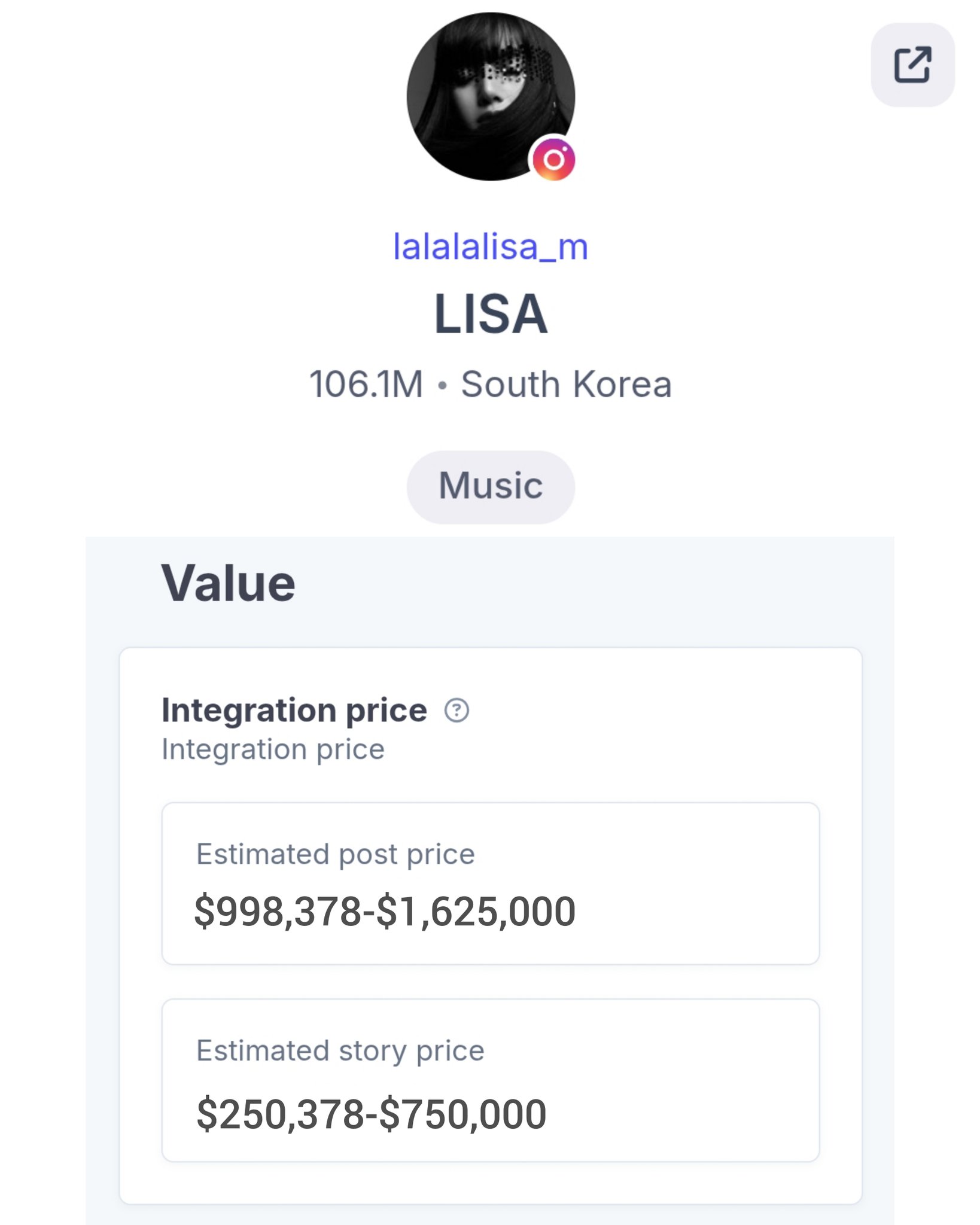 ข้อมูลล่าสุดจากเว็บ HypeAuditor ระบุว่า LISA มีมูลค่าต่อโพสต์สูงแบบก้าวกระโดด 1.6 ล้านเหรียญสหรัฐประมาณกว่า 51 ล้านบาท