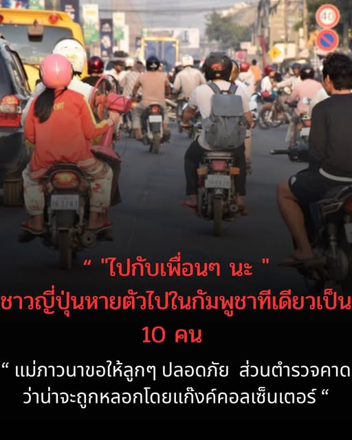 แม่... ผมไปเที่ยวกับเพื่อนๆนะ ชาวญี่ปุ่นหายตัวในกัมพูชาทีเดียวเป็น๑๐คน แม่ได้แต่ภาวนาให้ลูกปลอดภัย ตำรวจคาดอาจถูกหลอก