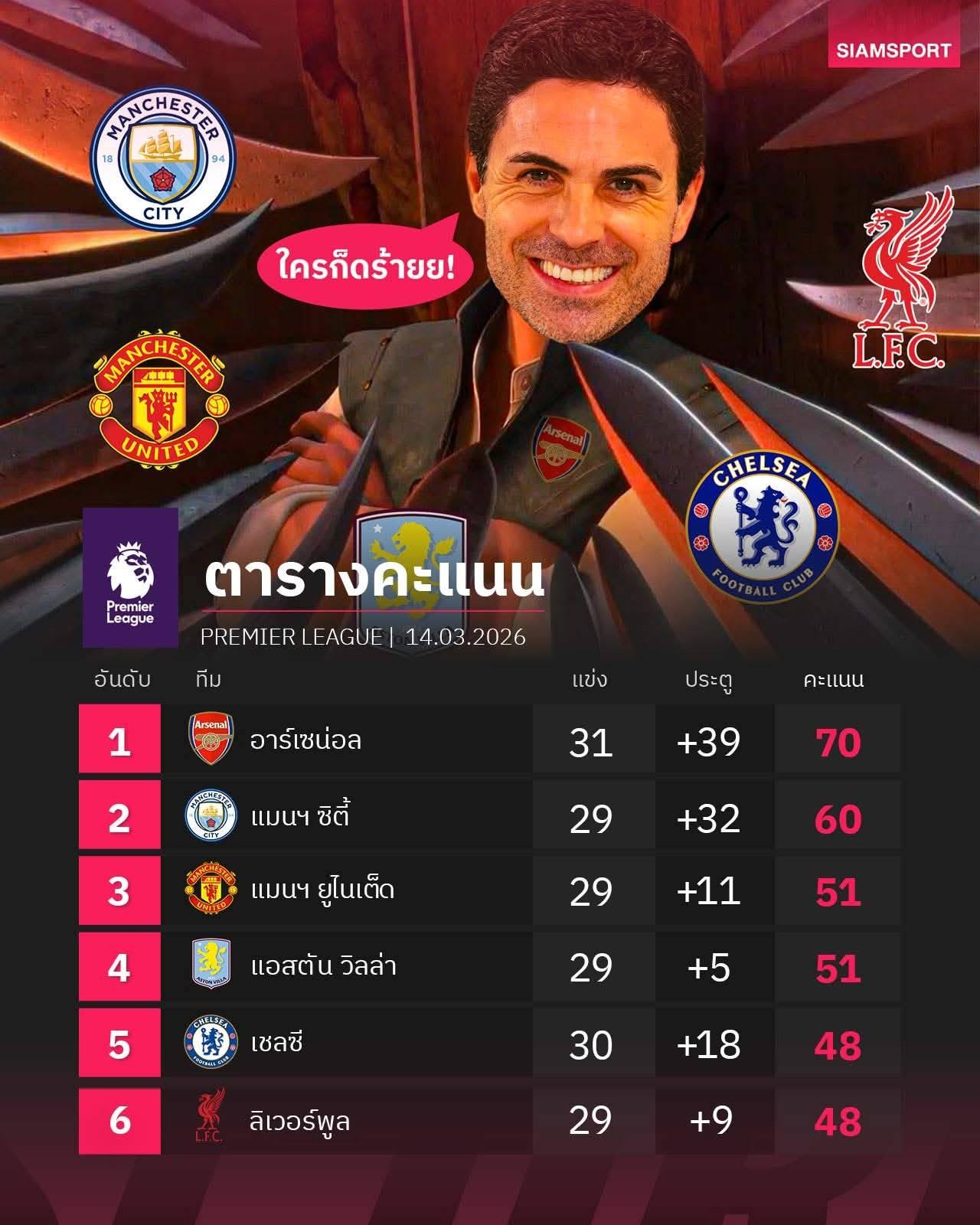 อัปเดตท็อป 6 พรีเมียร์ลีกล่าสุด 15-03-69