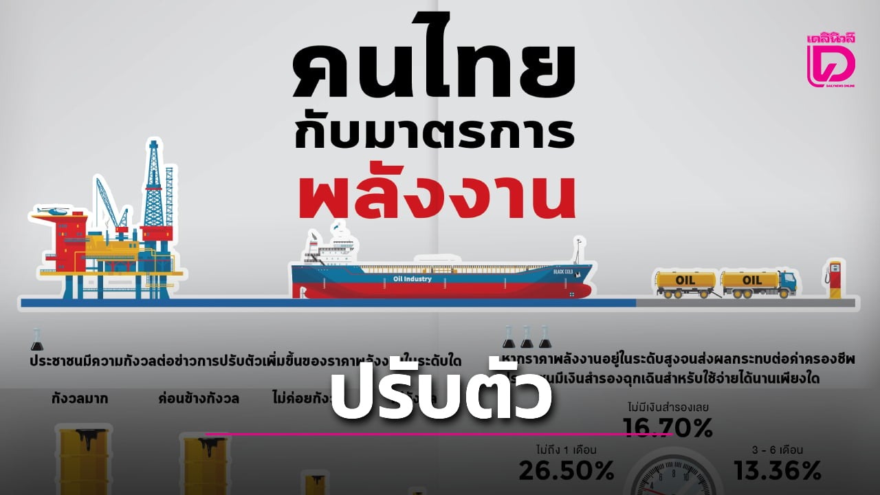 คนไทยกับมาตรการพลังงาน” กลุ่มตัวอย่างจ านวน 1,347 คน (สำรวจทางออนไลน์และภาคสนาม) ระหว่างวันที่ 11-13 มีนาคม 2569 ผลการสำรวจ พบว่า กลุ่มตัวอย่าง ร้อยละ 45.88 รู้สึกกังวลมากจากข่าวการปรับตัวเพิ่มขึ้นของราคาพลังงาน รองลงมาคือ ค่อนข้างกังวล ร้อยละ 44.10 โดยเตรียมรับมือด้วยการปรับเปลี่ยนพฤติกรรมโดยเฉพาะการปิดไฟและอุปกรณ์ไฟฟ้าที่ไม่จำเป็น ร้อยละ 69.93 หากราคาพลังงานสูงจนกระทบต่อค่าครองชีพจะมีเงินสำรองฉุกเฉินประมาณ 1-3 เดือน ร้อยละ 30.51 ทั้งนี้ต้องการให้รัฐบาลช่วยเหลือด้วยการตรึงราคาน้ำมัน/ก๊าซหุงต้มให้นานที่สุด ร้อยละ 71.05