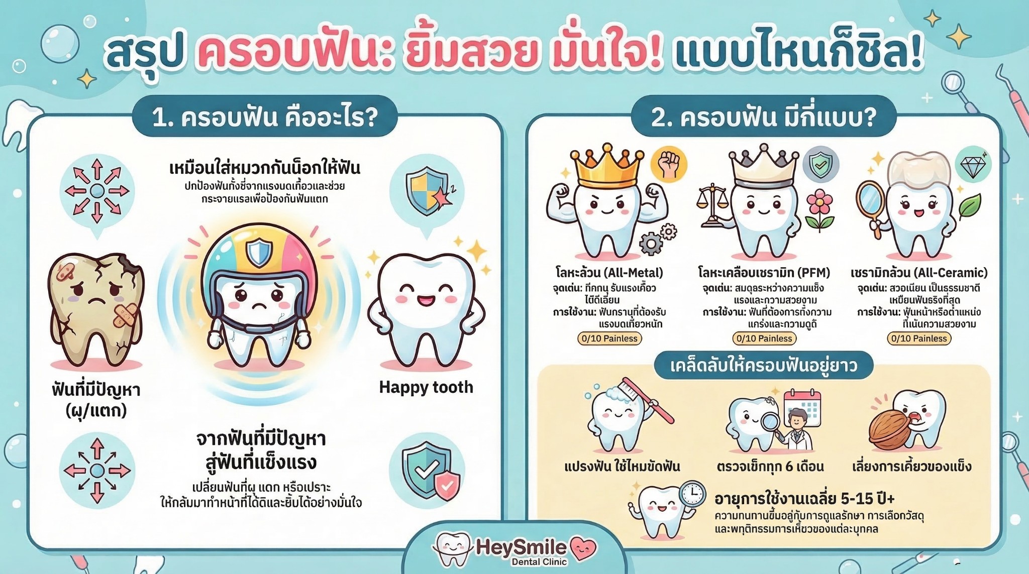 สรุปส่งท้าย ไม่มีวัสดุไหนที่ดีที่สุดสำหรับทุกคนครับ มีแต่วัสดุที่ "เหมาะสมที่สุด" สำหรับฟันซี่นั้นและพฤติกรรมของคุณ การให้คุณหมอช่วยประเมินและเลือกวัสดุให้ จะช่วยเซฟเงินและทำให้ครอบฟันอยู่กับเราไปได้นานๆ ครับ