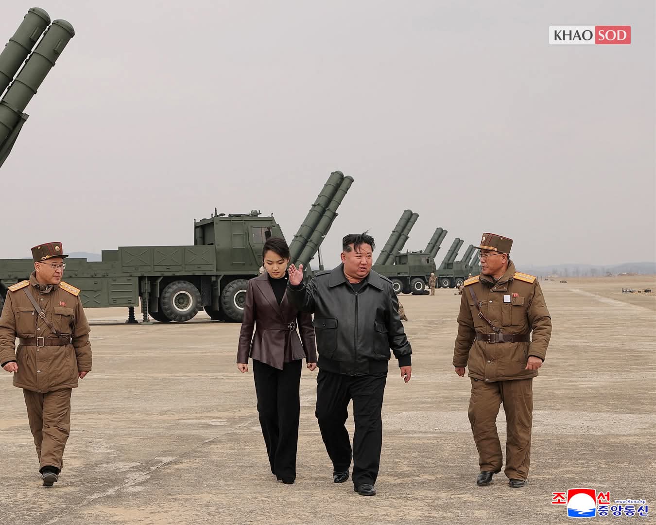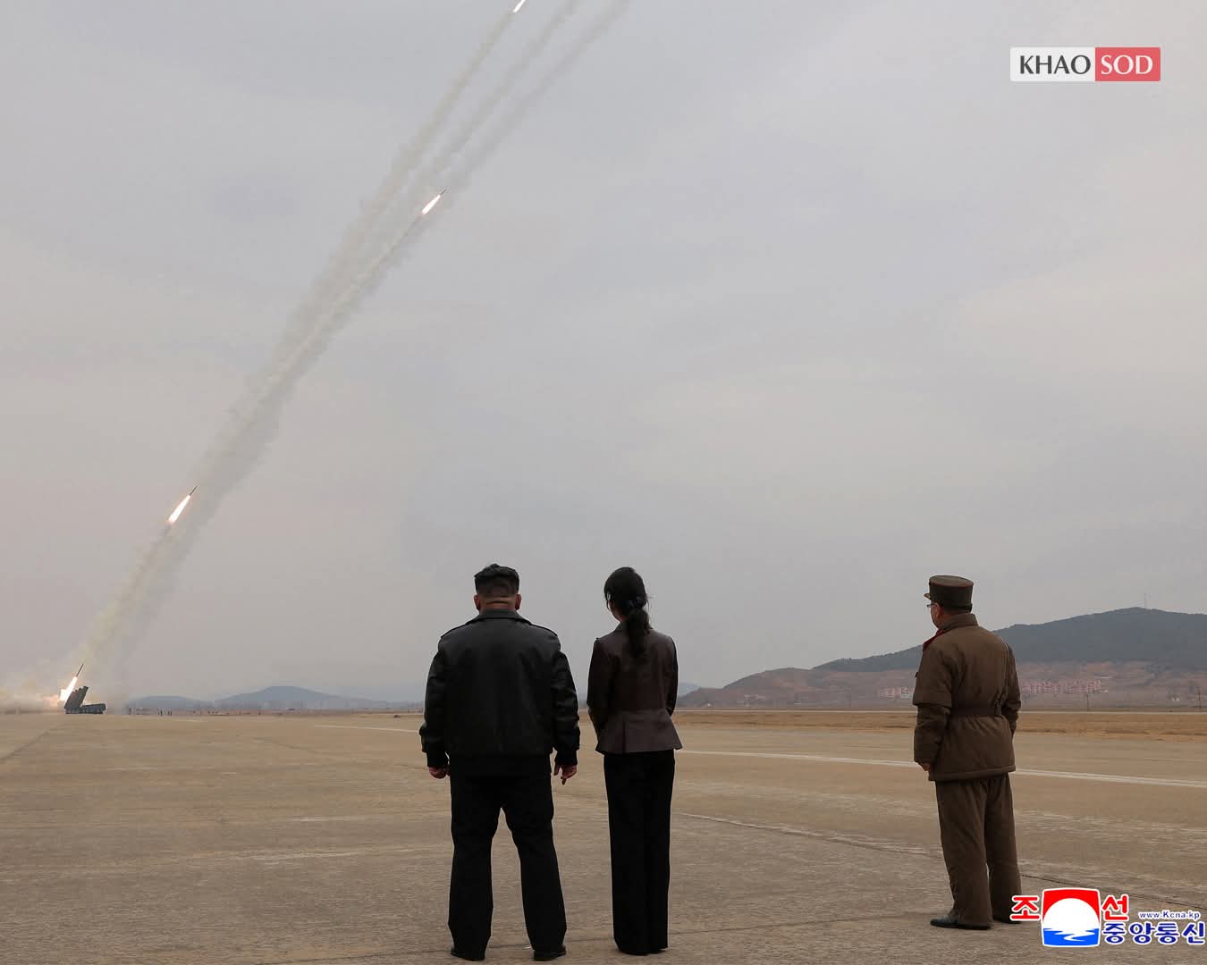 คิม จอง-อึน ผู้นำเกาหลีเหนือ พร้อม คิม จู-แอ ลูกสาว ชมการทดสอบการยิงจรวดหลายลำกล้อง ขนาด 600 มม. จำนวน 12 เครื่อง ช่วงเดียวที่สหรัฐอเมริกา เตรียมซ้อมรบประจำปีกับเกาหลีใต้ภายในสัปดาห์นี้