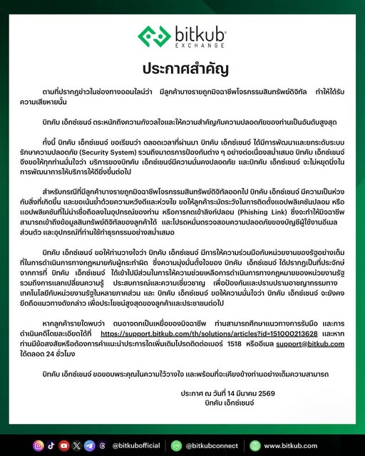 หากลูกค้ารายใดพบว่า ตนอาจตกเป็นเหยื่อของมิจฉาชีพท่านสามารถศึกษาแนวทางการรับมือและการดำเนินคดีโดยละเอียดได้ที่ https://support.bitkub.com/th/solutions/articles... และหากท่านมีข้อสงสัยหรือต้องการคำแนะนำประการใดเพิ่มเติม โปรดติดต่อเบอร์ 1518 หรืออีเมล support@bitkub.com ได้ตลอด 24 ชั่วโมง