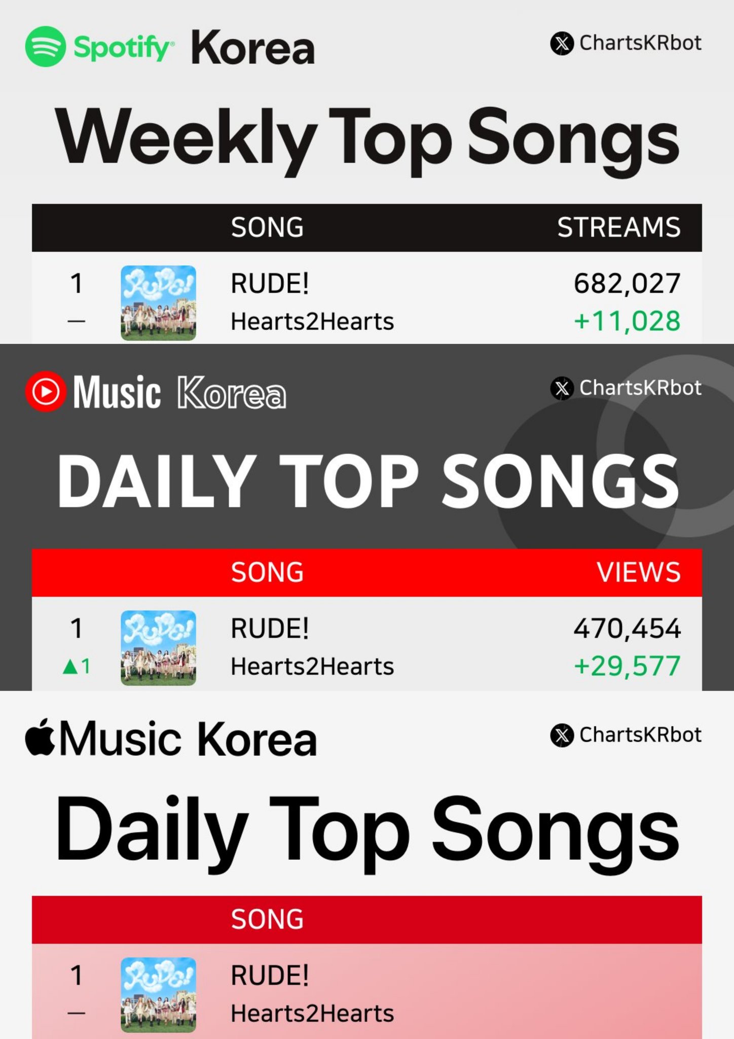 Hearts2Hearts “RUDE!” ขึ้นอันดับ 1 บนชาร์ตเกาหลีของ Spotify, Apple Music และ YouTube Music ได้สําเร็จ 🎉