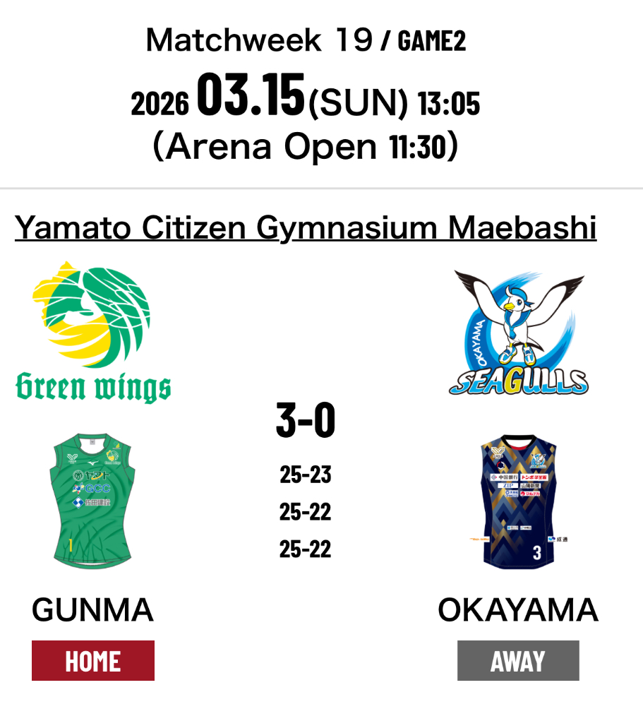 3.Gunma Bank Green Wings 3-0 Okayama Seagulls (25-23 25-22 25-22)