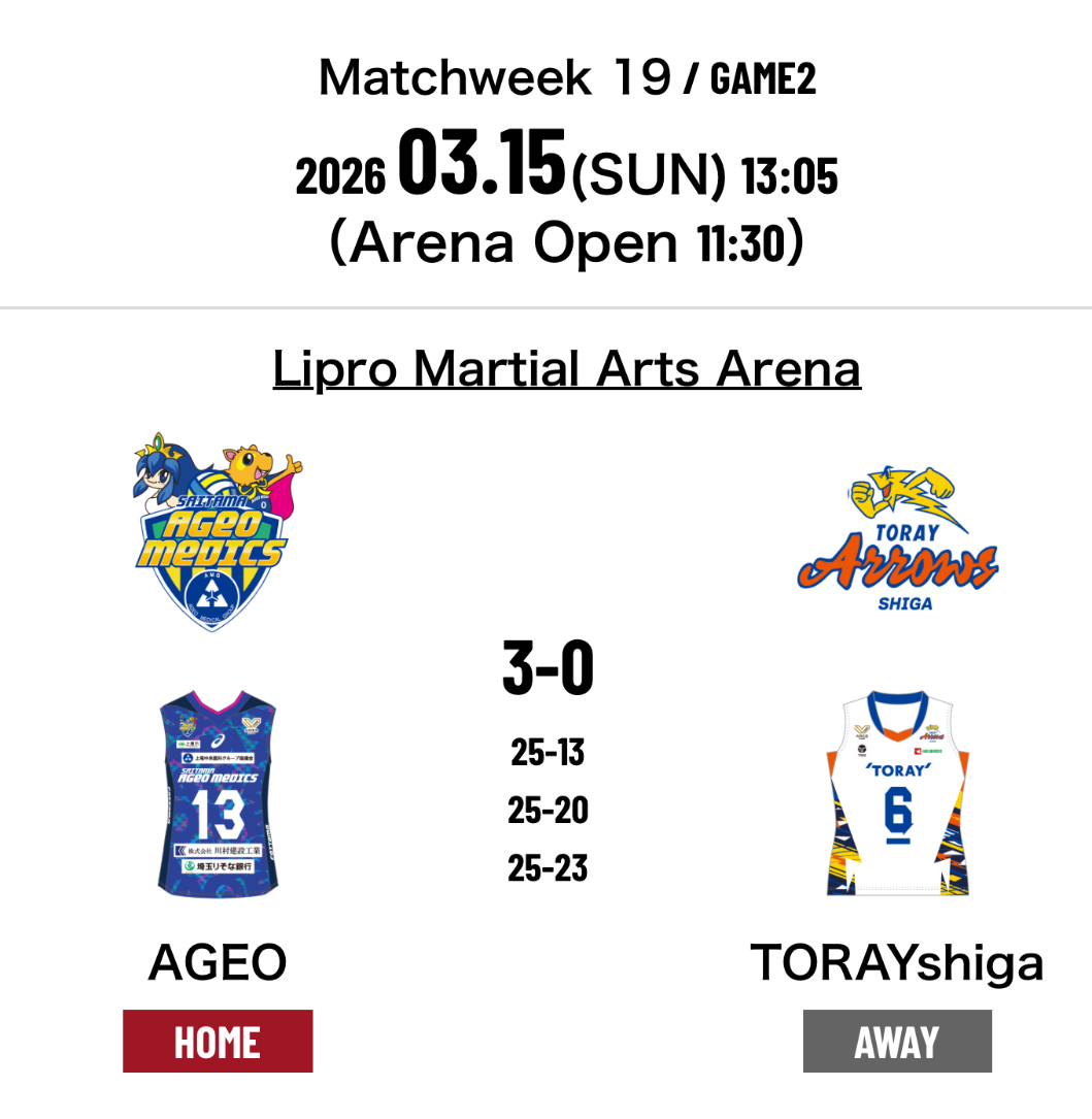 4.Saitama Ageo Medics 3-0 Toray Arrows Shiga (25-13 25-20 25-23)